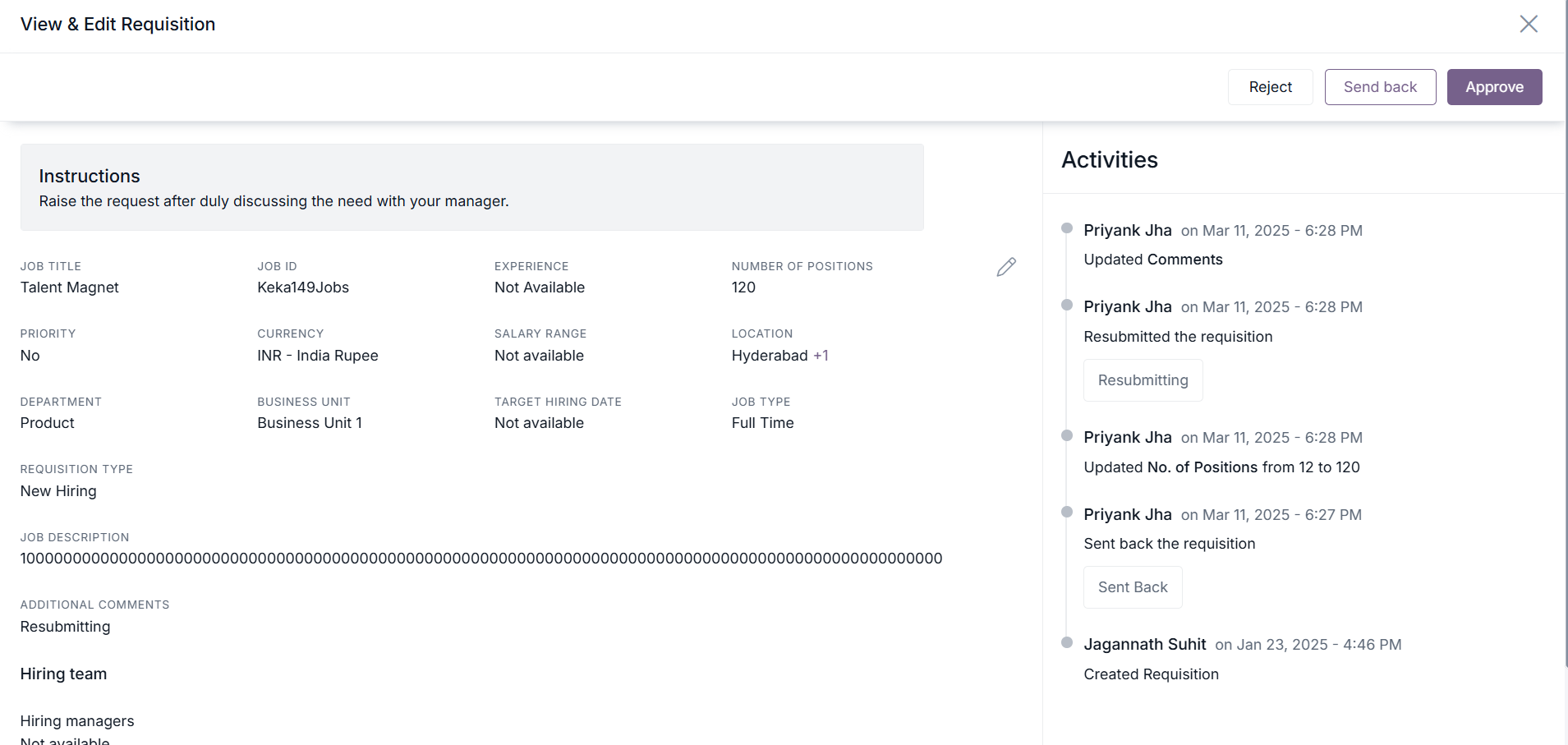 Hire module allows requisition reviewers to send requisitions back to the creator for edits instead of outright denial. This enhancement streamlines collaboration, reduces duplication, and ensures faster correction and resubmission of requisitions.