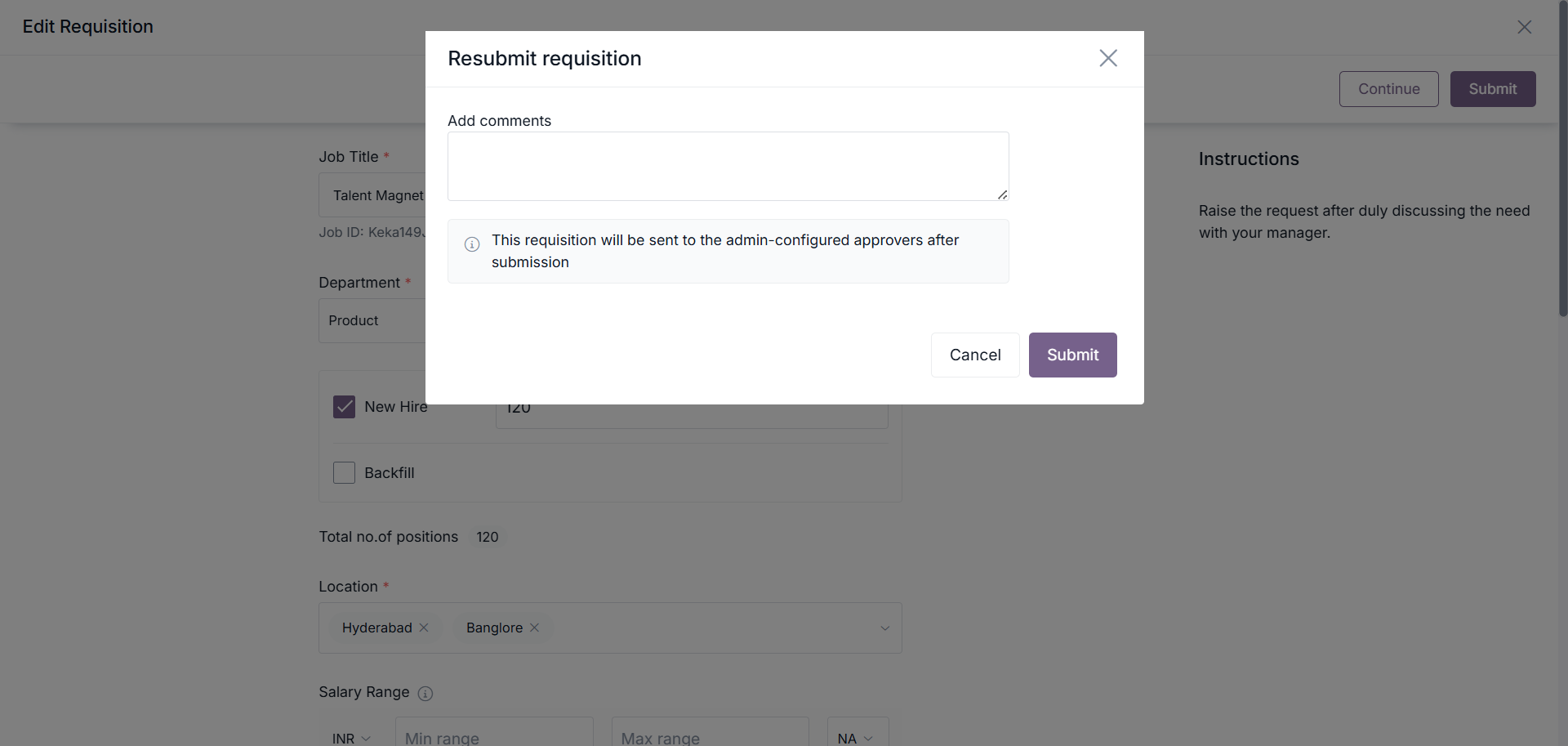 During re-submission, requisition creators can also add comments to explain their updates or justification for the revision.