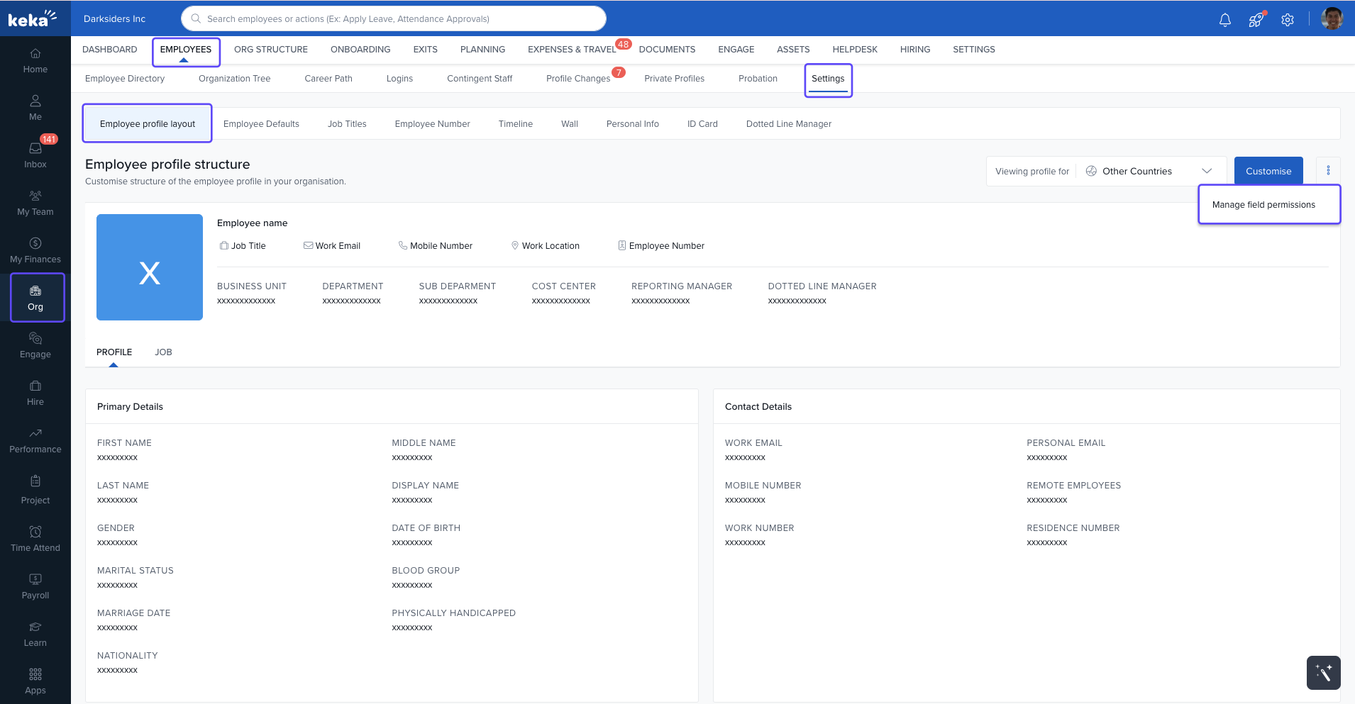Go to Org > Employees > Settings > Employee Profile Layout.