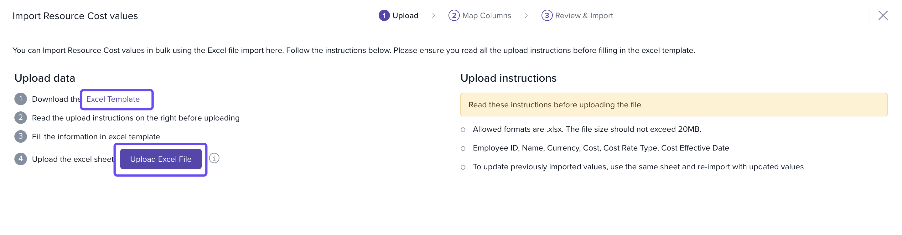 - Match Columns to align Excel headers with system fields.