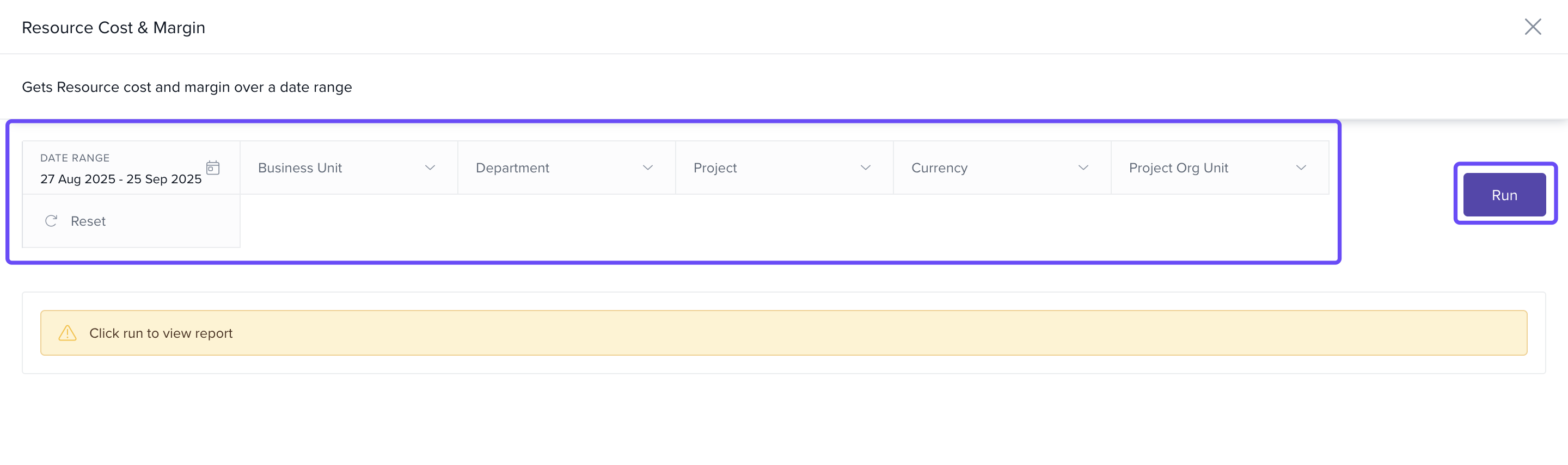 - Choose Reports and select Resource Cost and Margin.