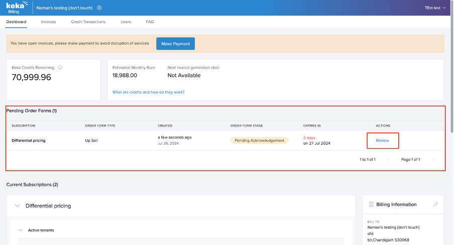 After the upsell has been initiated through keka. You can log in to the Keka Billing portal at billing.keka.com. Under pending order forms, you have to click review to see the updates.