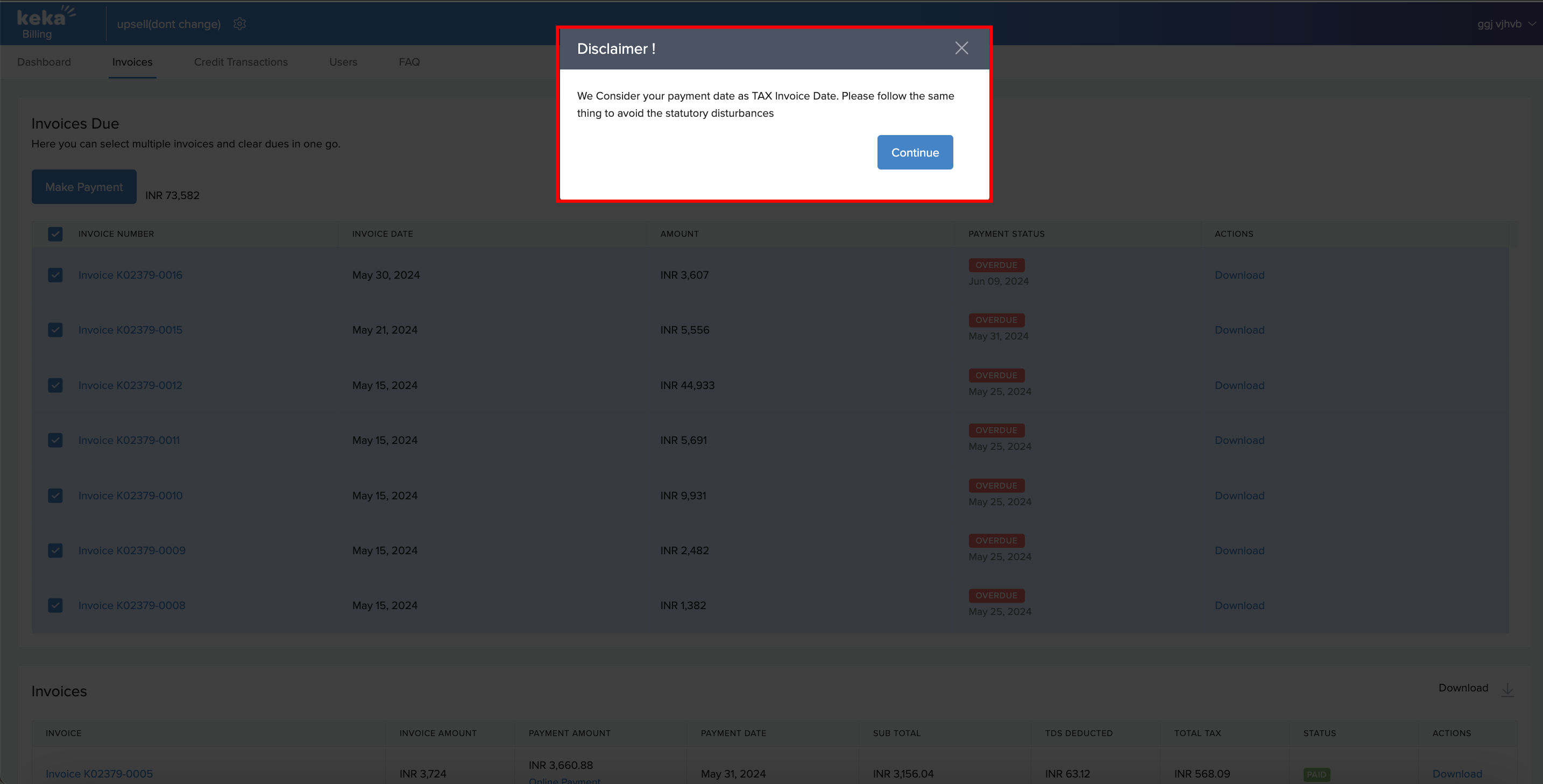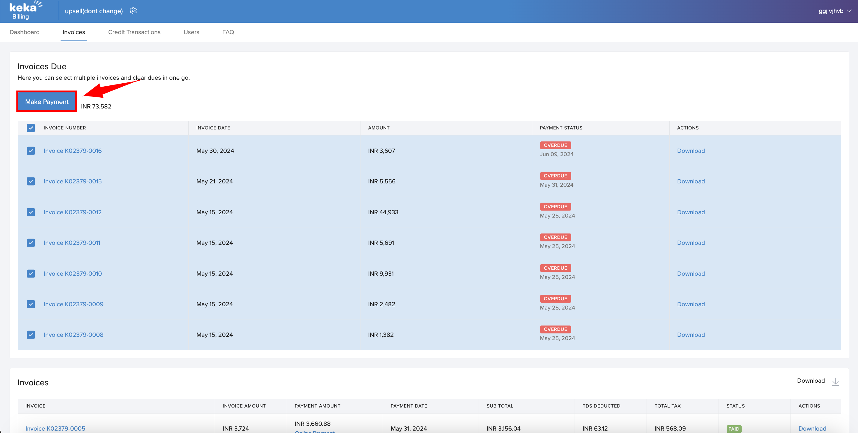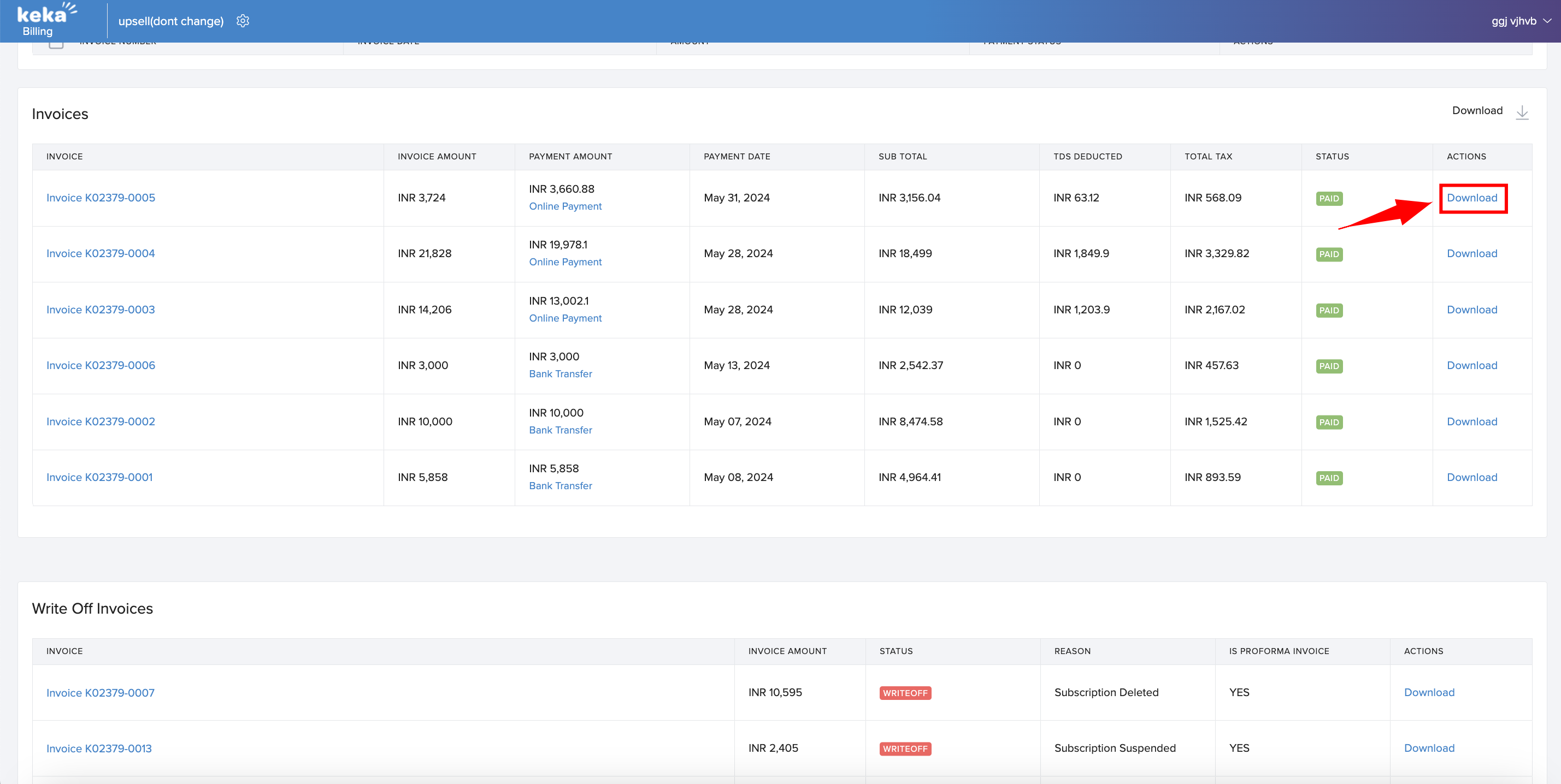 You can easily download the tax invoice for the payment you just made by clicking on the download option next to the specific invoice you need the tax invoice for.