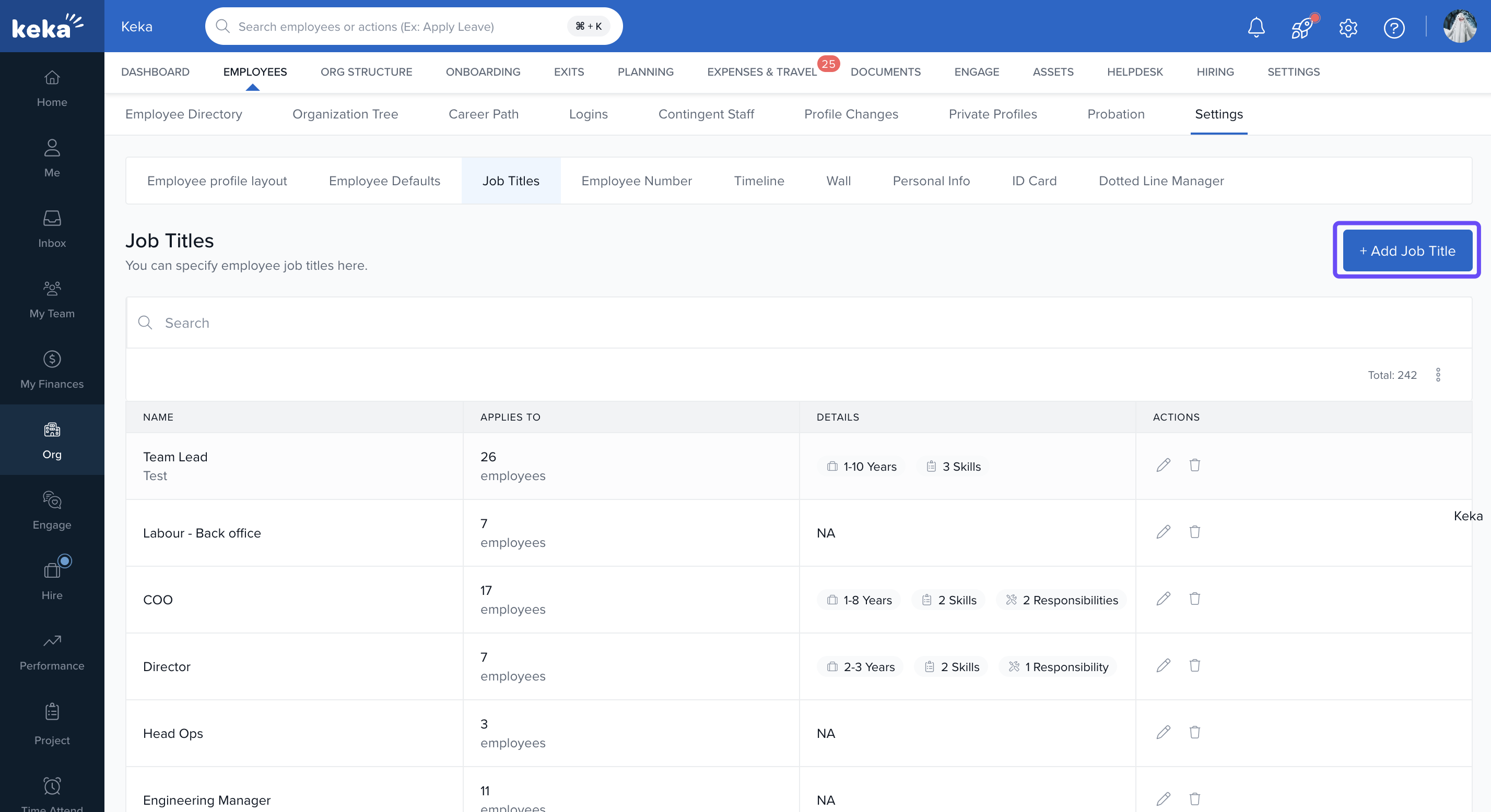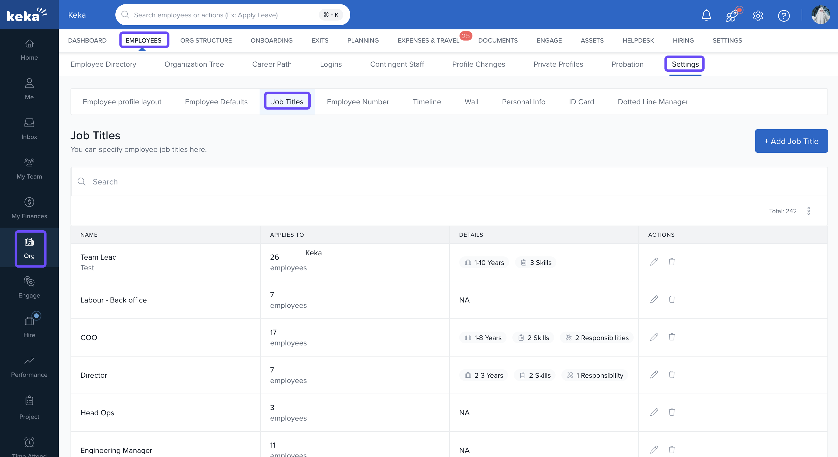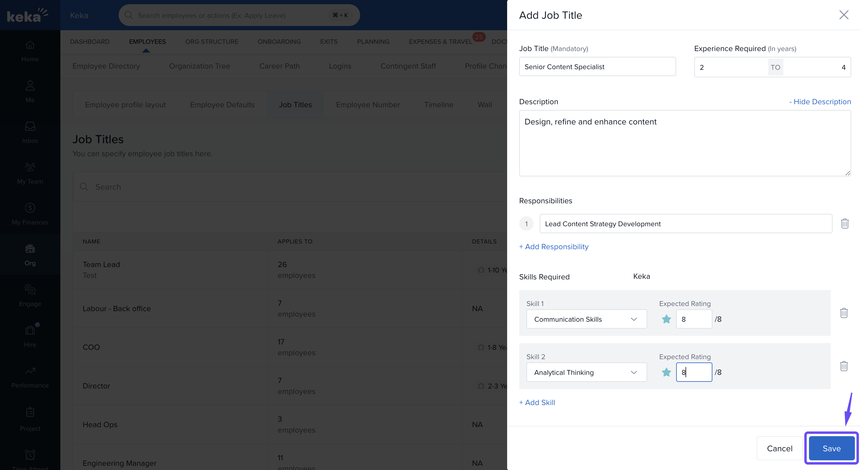 Keka enables you to create detailed job profiles by defining job titles, and enriching them with key responsibilities, required skills, experience expectations, and performance metrics. This helps ensure transparency in role expectations and supports structured evaluations.