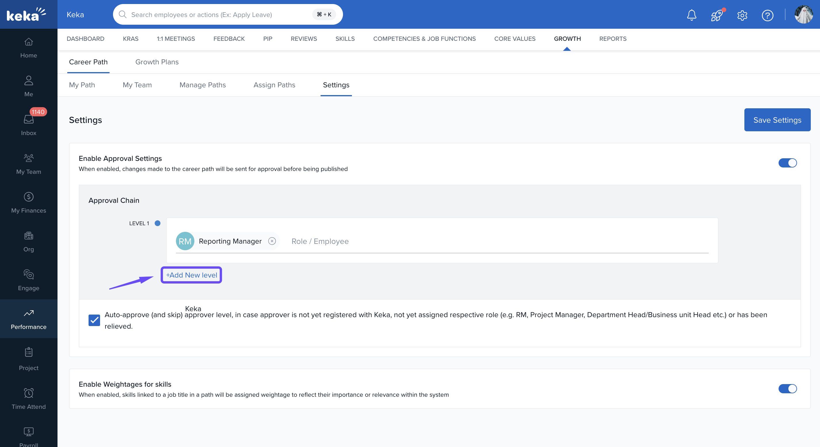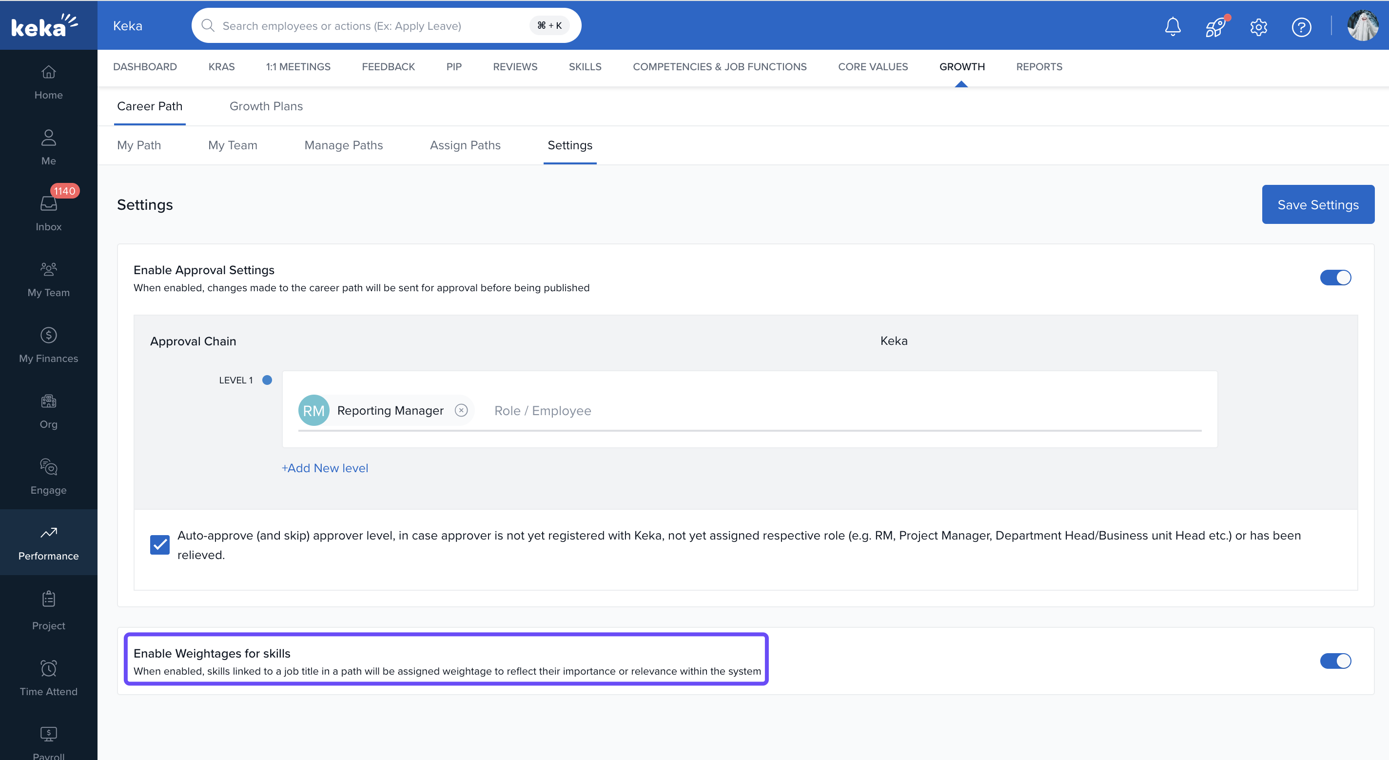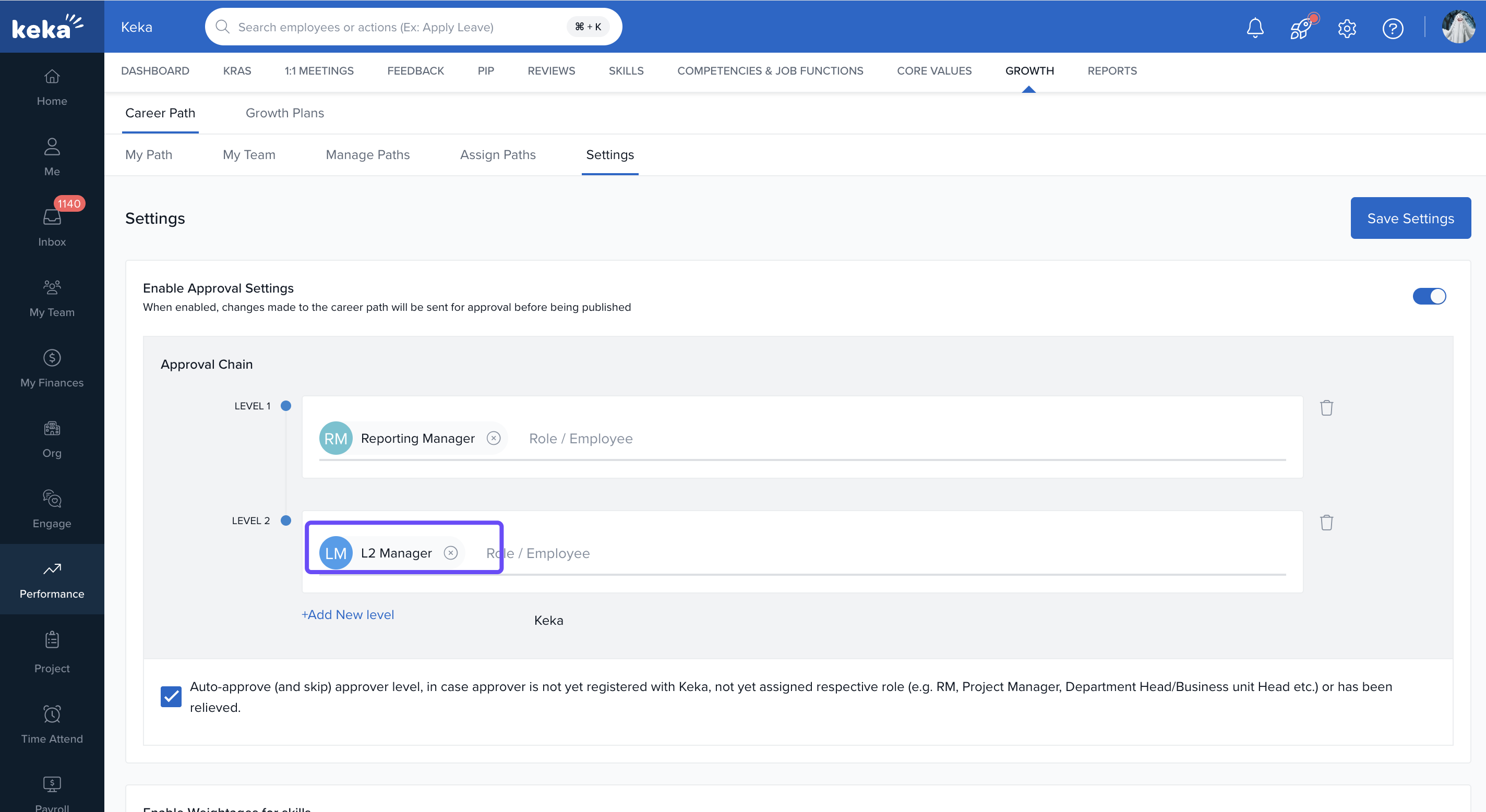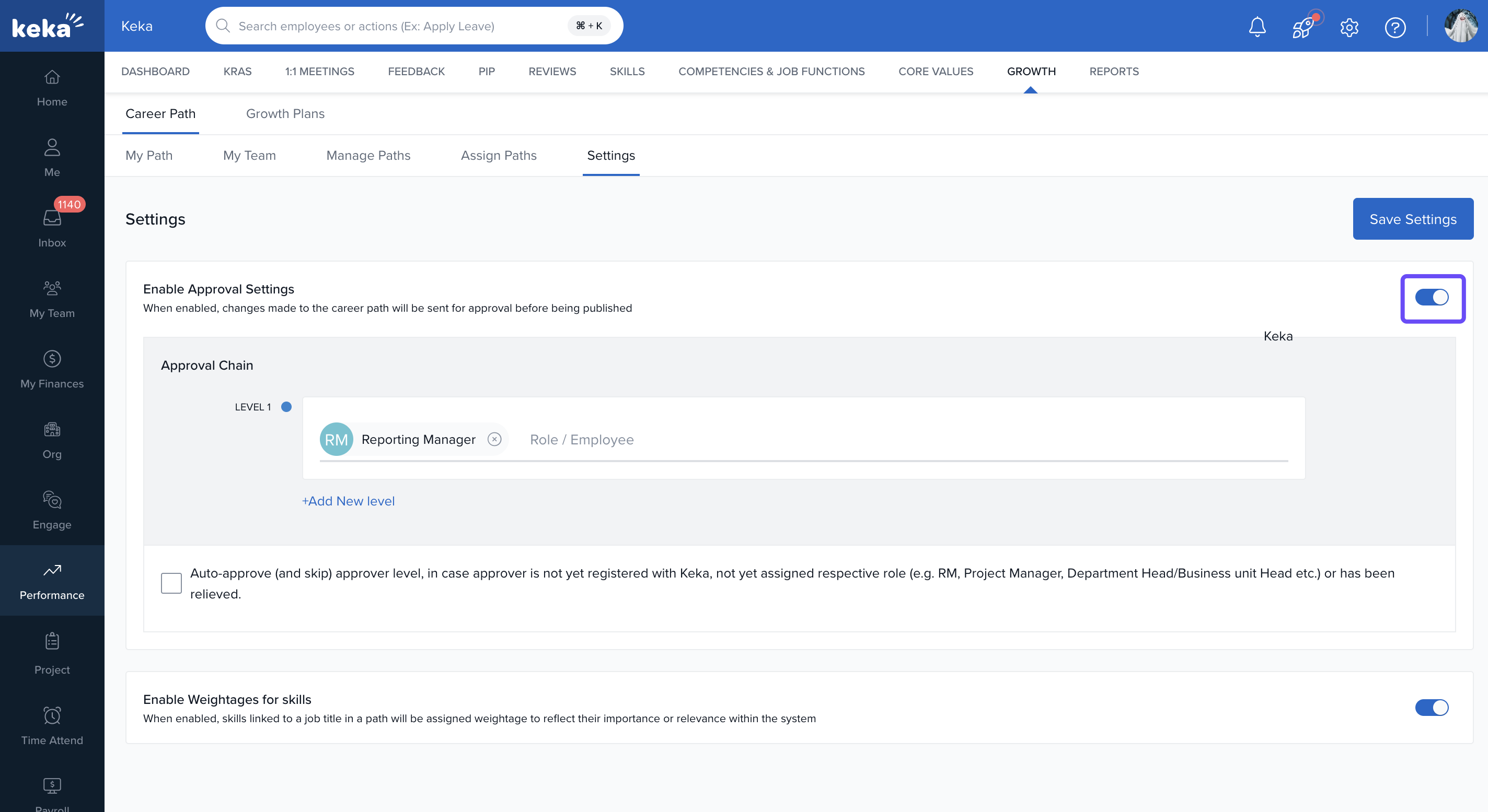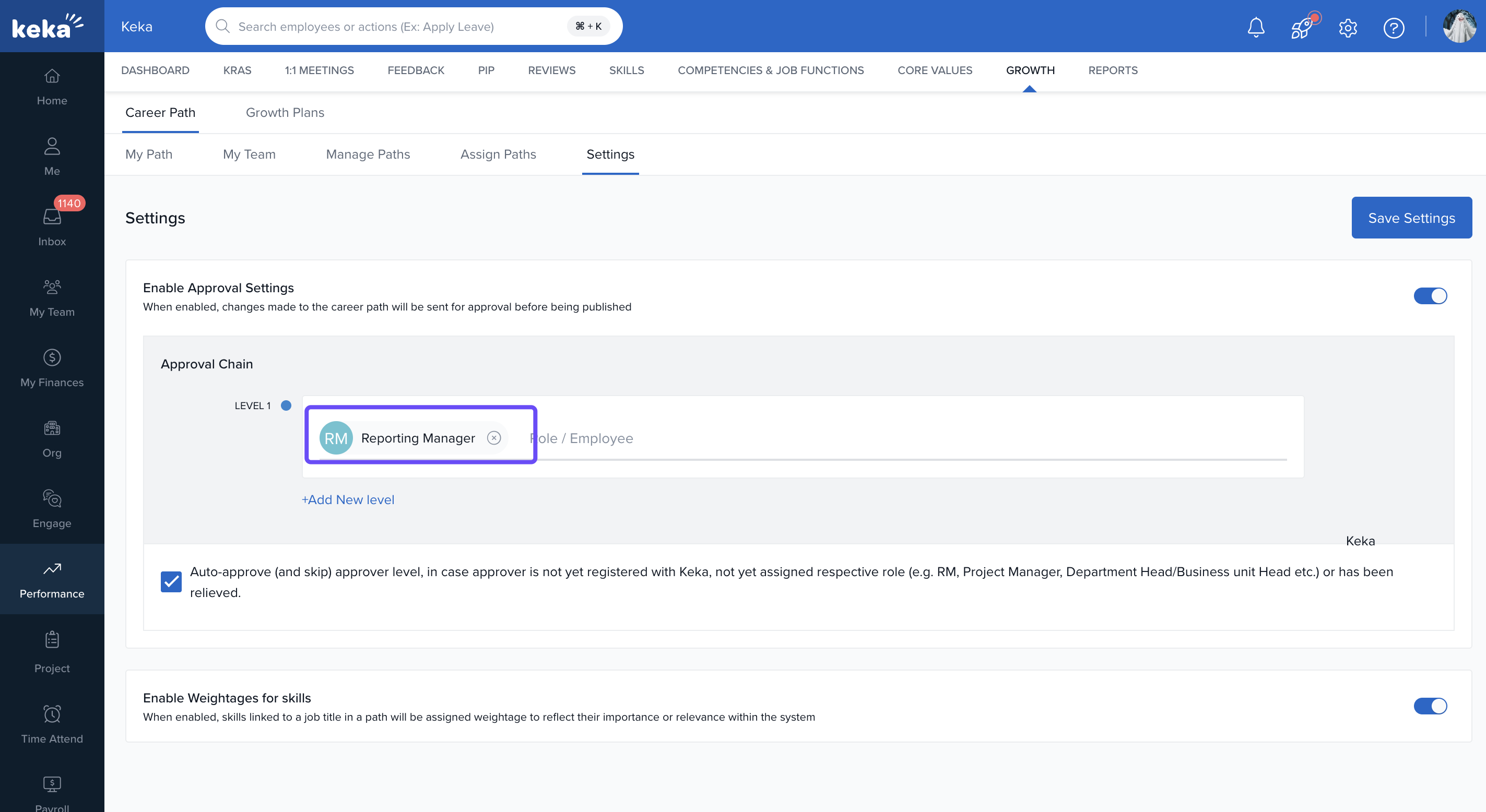 Keka’s Settings Configuration for Career Paths helps organisations create a structured, review-based process to approve any changes made to defined paths. With approval levels and skill weightage options, this workflow ensures that edits go through the right stakeholders before going live.