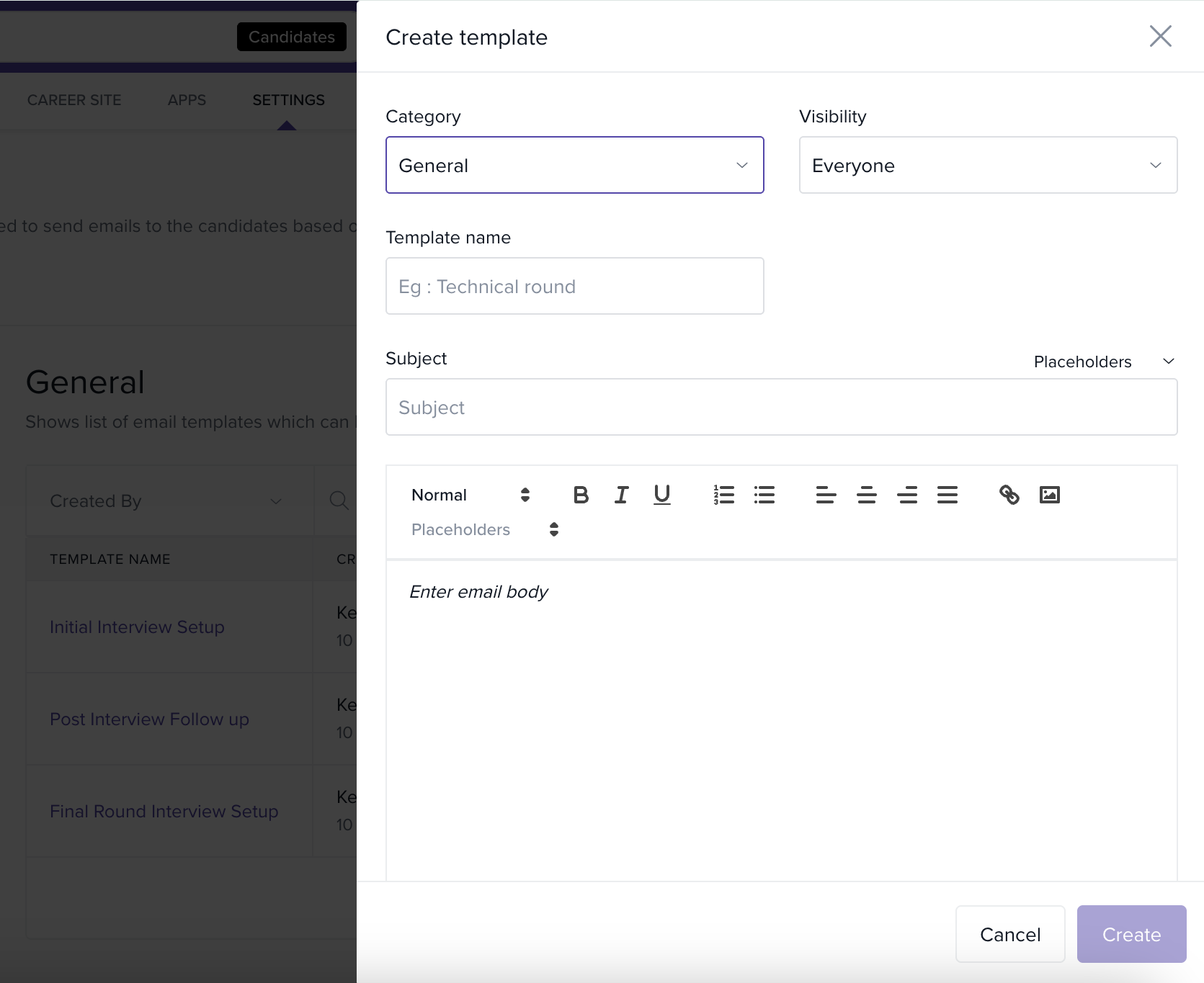 Tip: Use categories to keep templates organized (e.g., Interview, Rejection, Offer).
