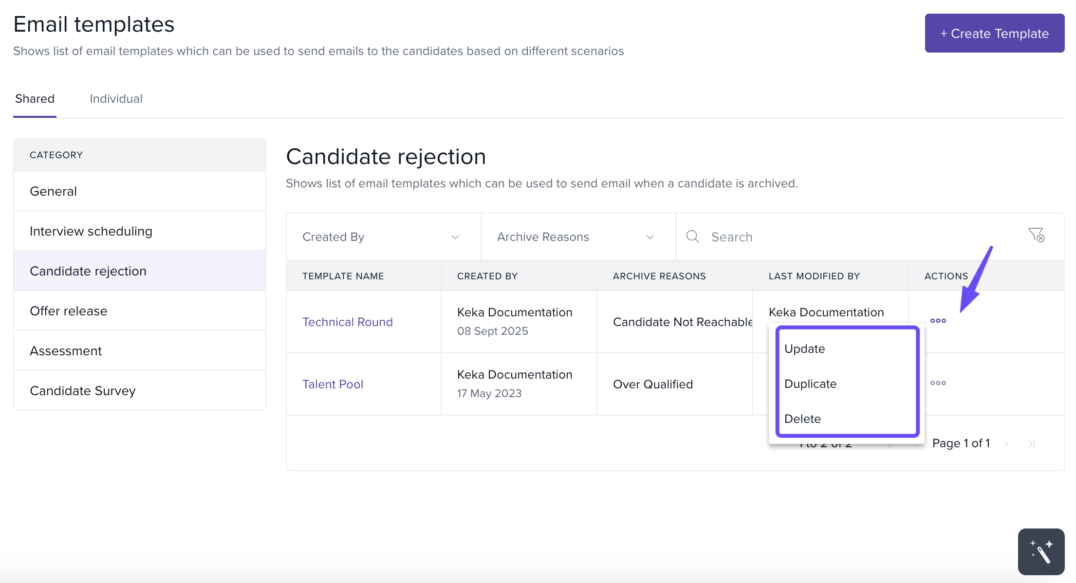 Use the three dots in the Actions column to manage the template: