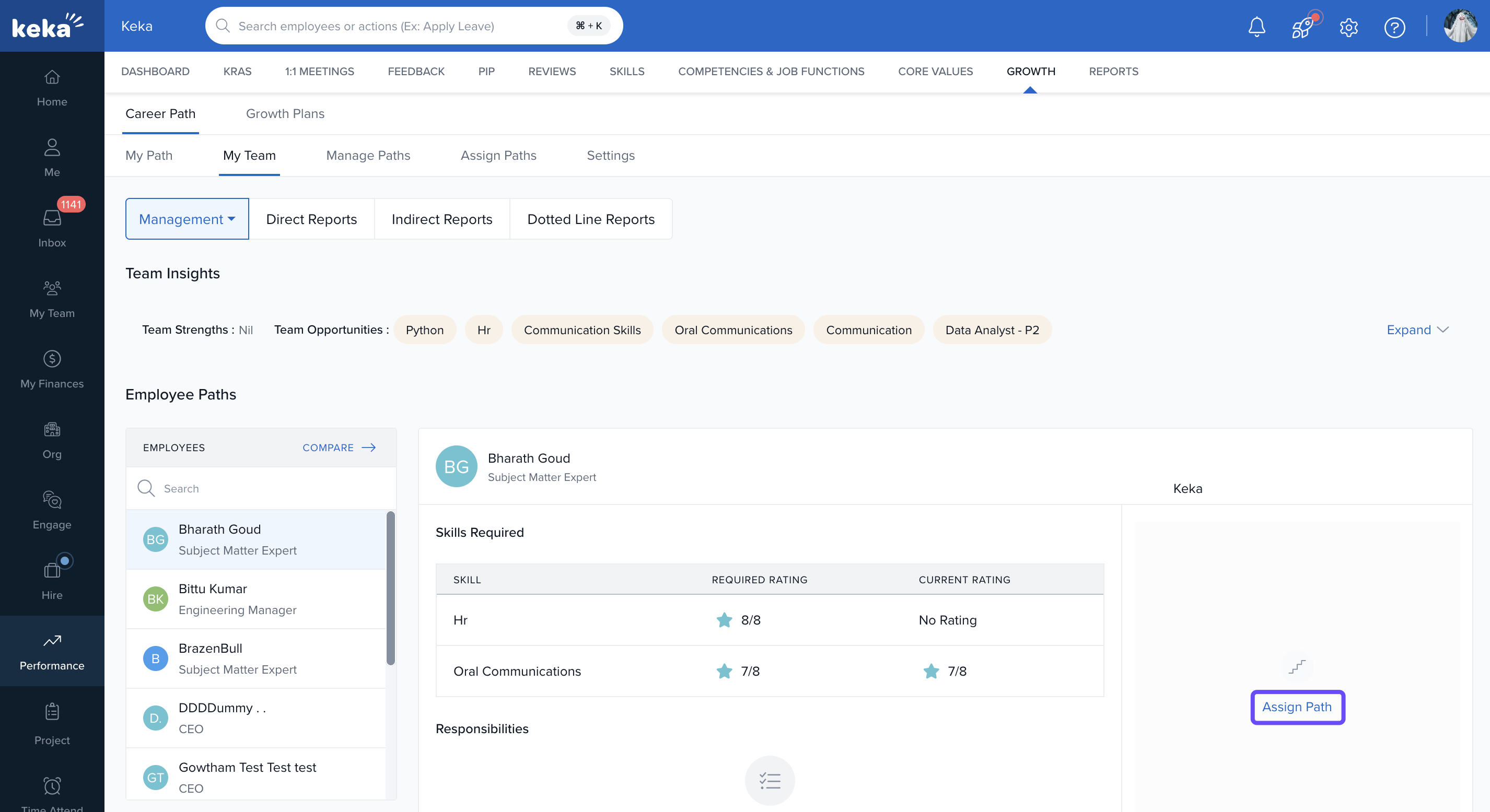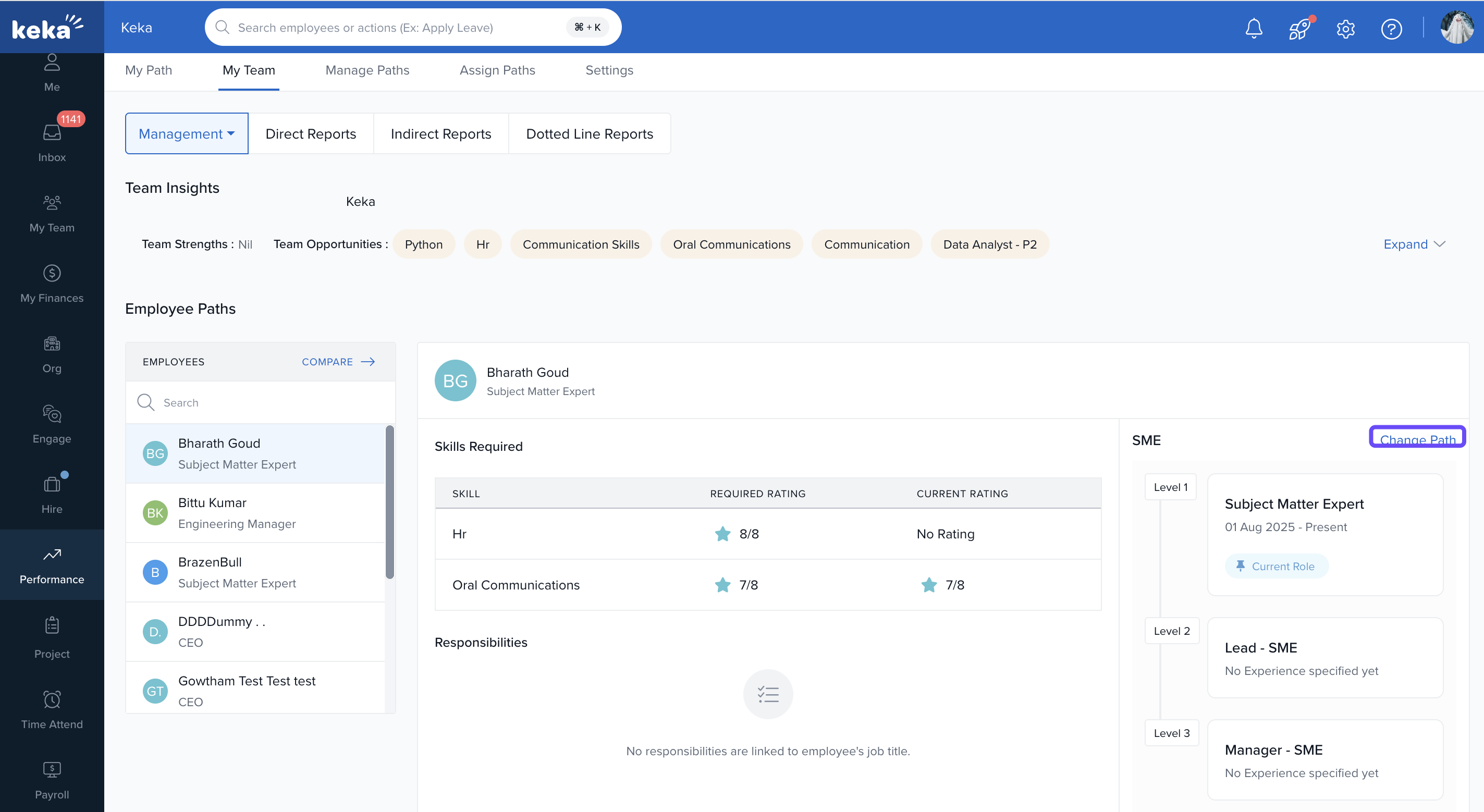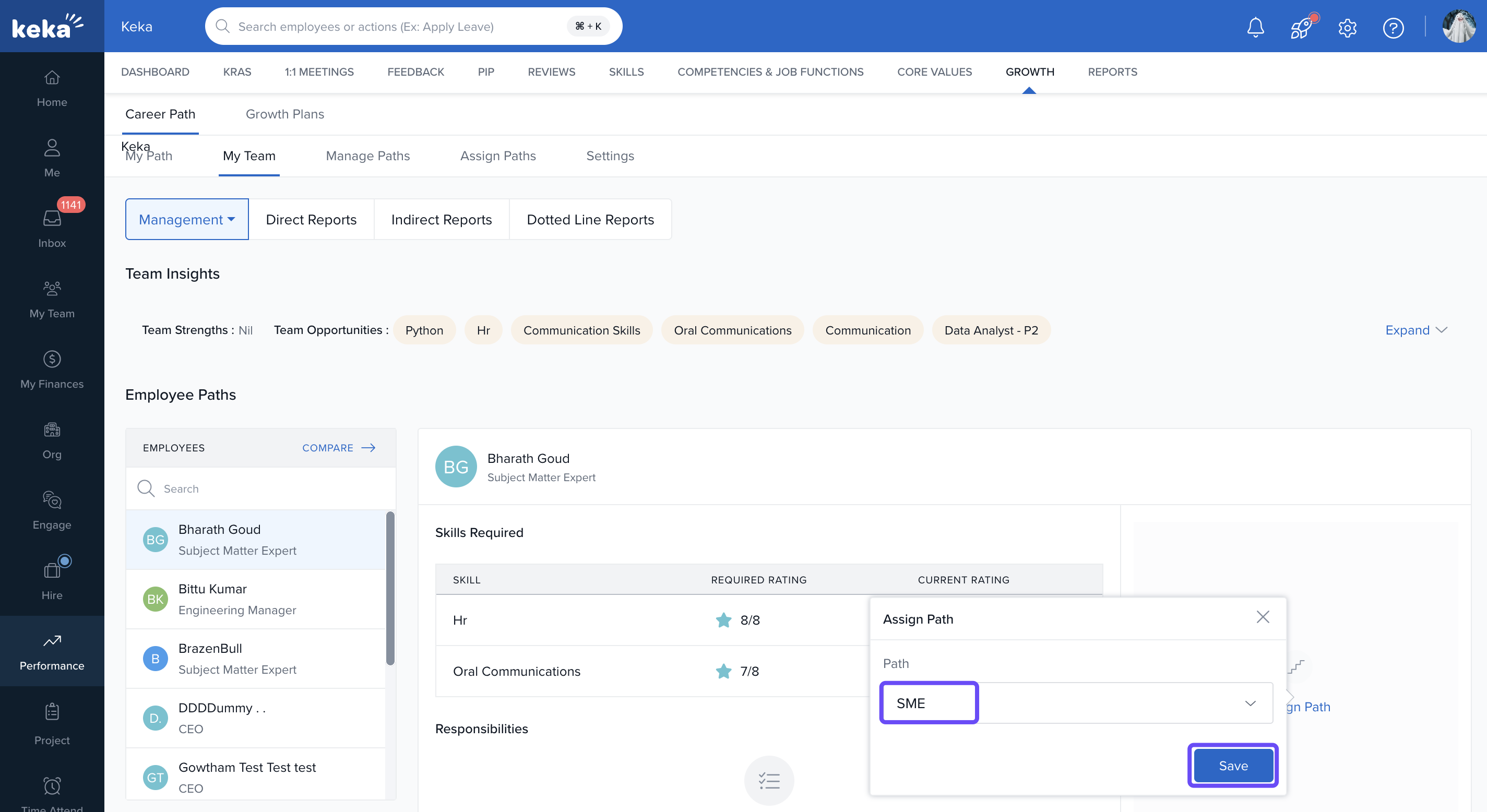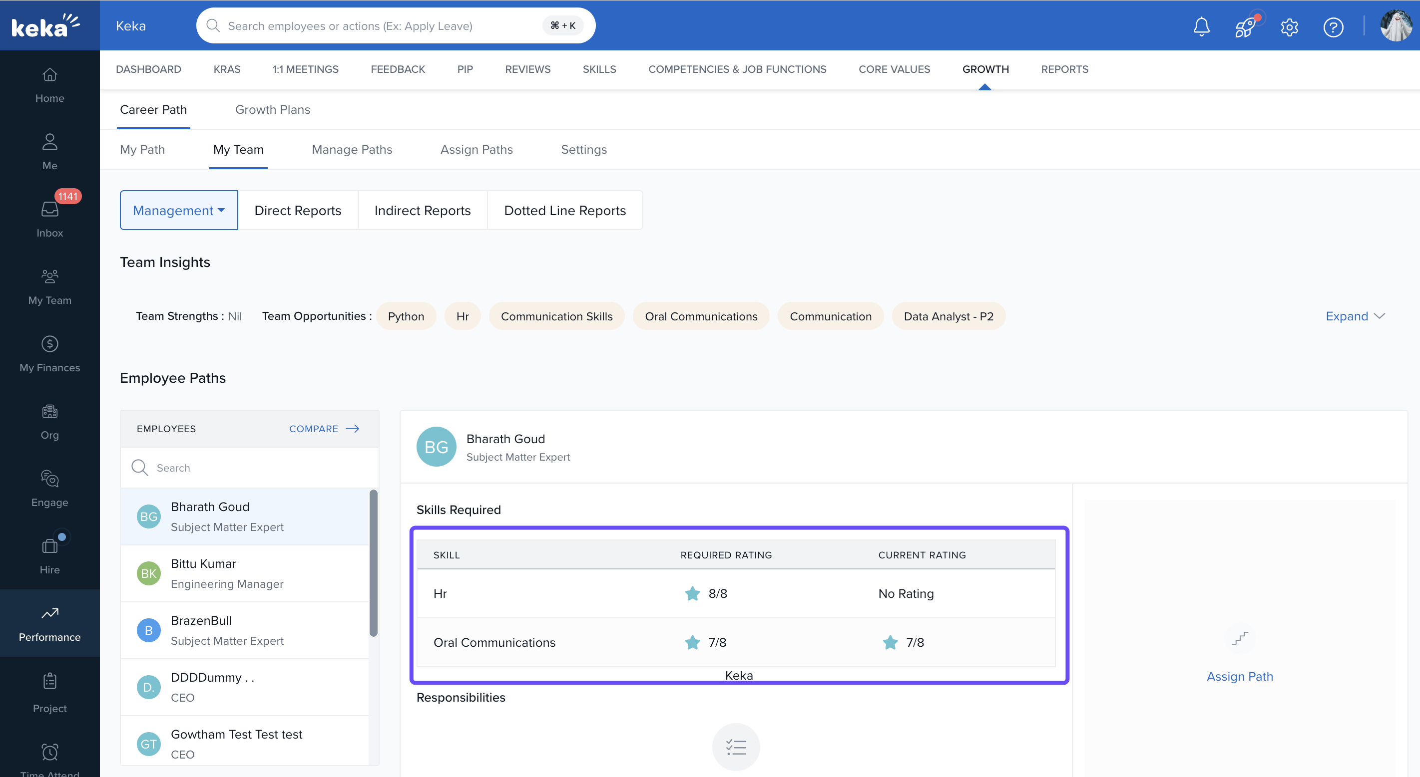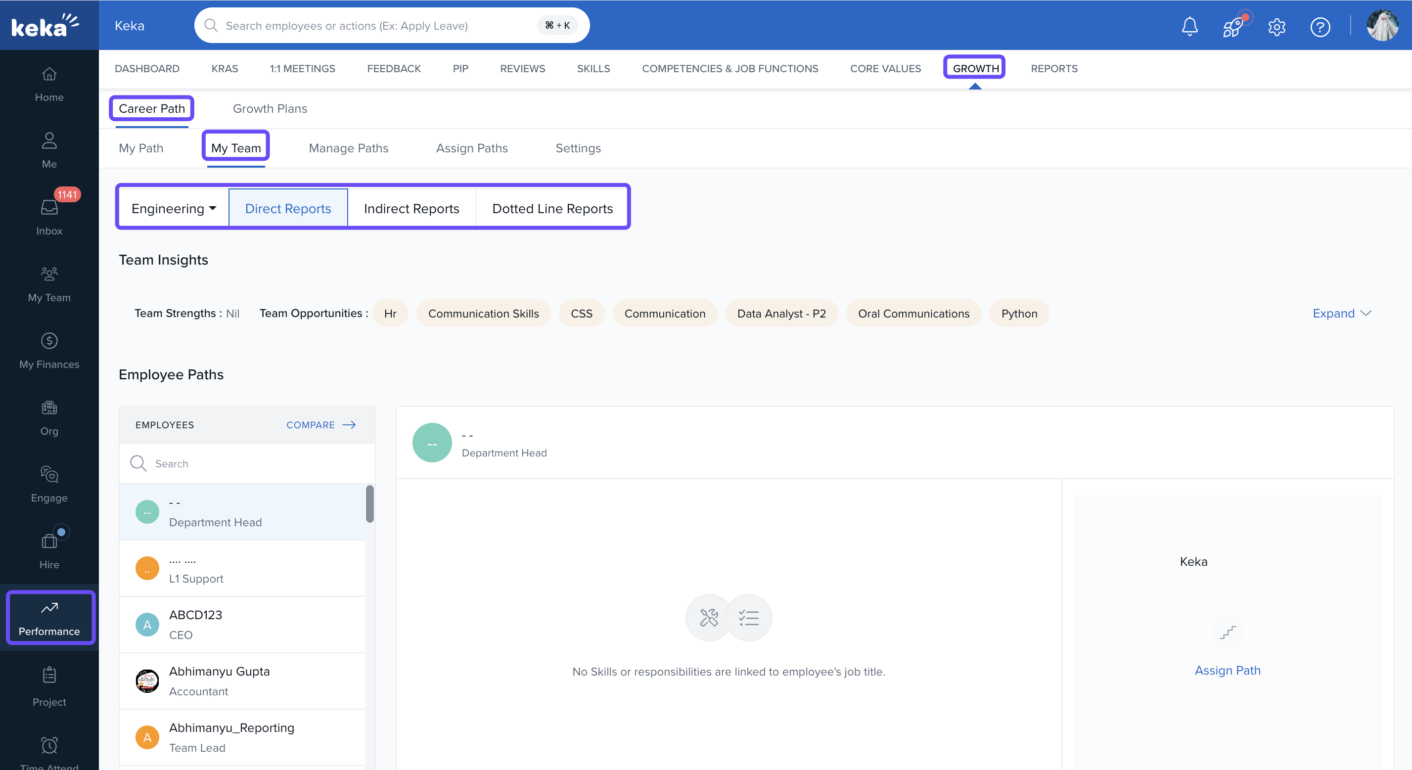 In the My Team section of Keka, managers and department heads can assess team members' strengths and assign career tracks that align with both their growth goals and the organisation’s needs.