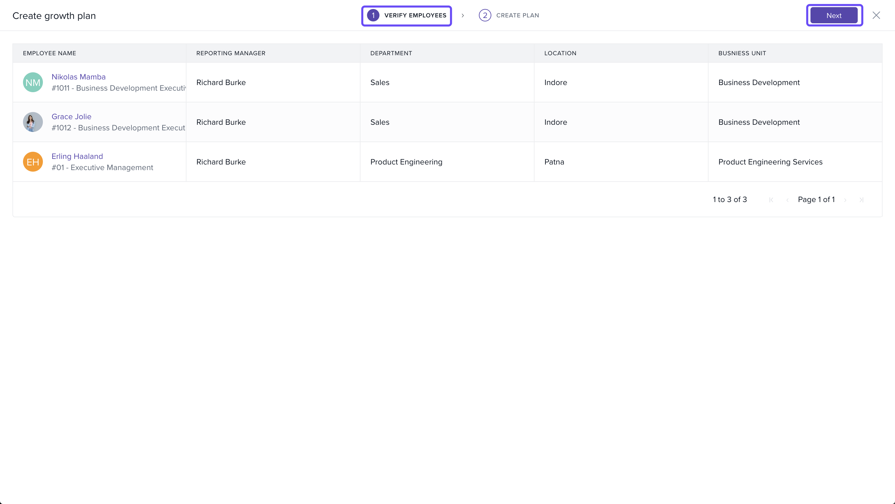 In the Create Growth Plan window, verify the selected employees and click Next.