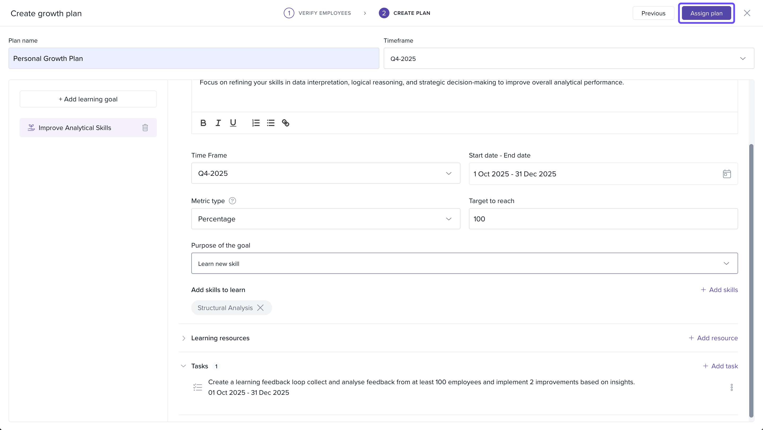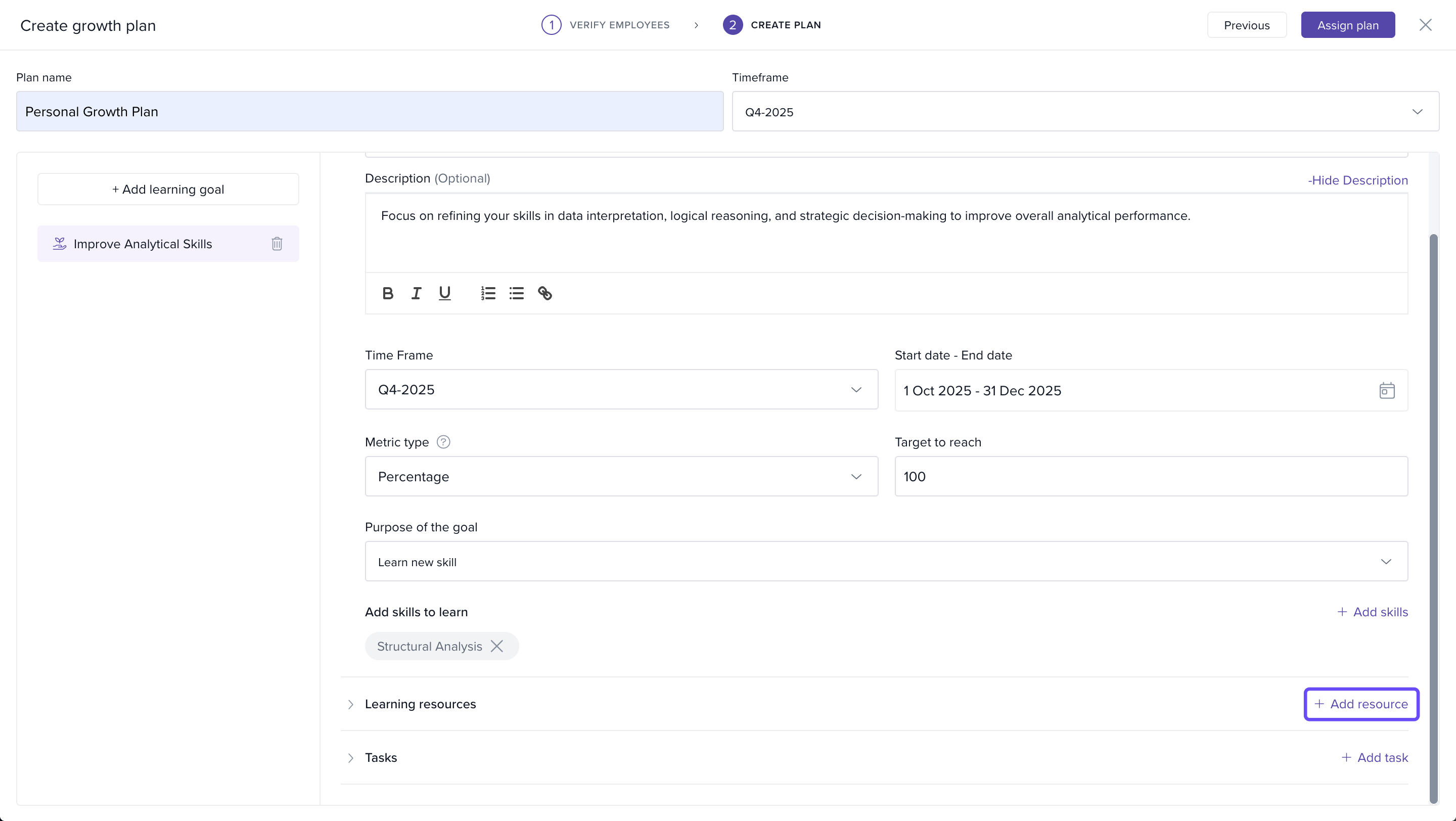 Enter the Plan Name, Timeframe, Goal, Description (Optional), Dates, Metric Type, and Goal Purpose, Target to reach.
