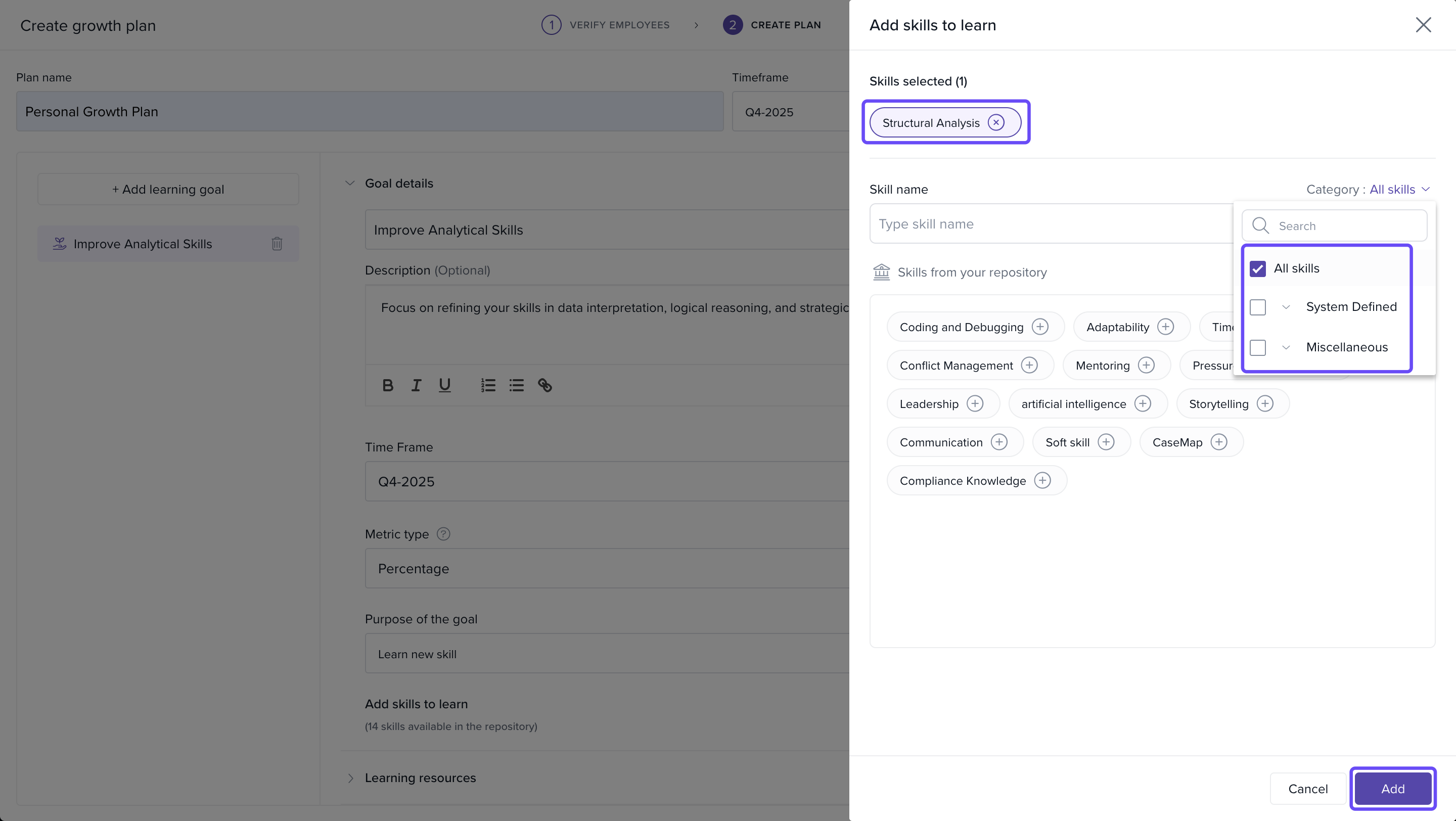 Choose from categories like System Defined, Miscellaneous, or All Skills, then click Add.