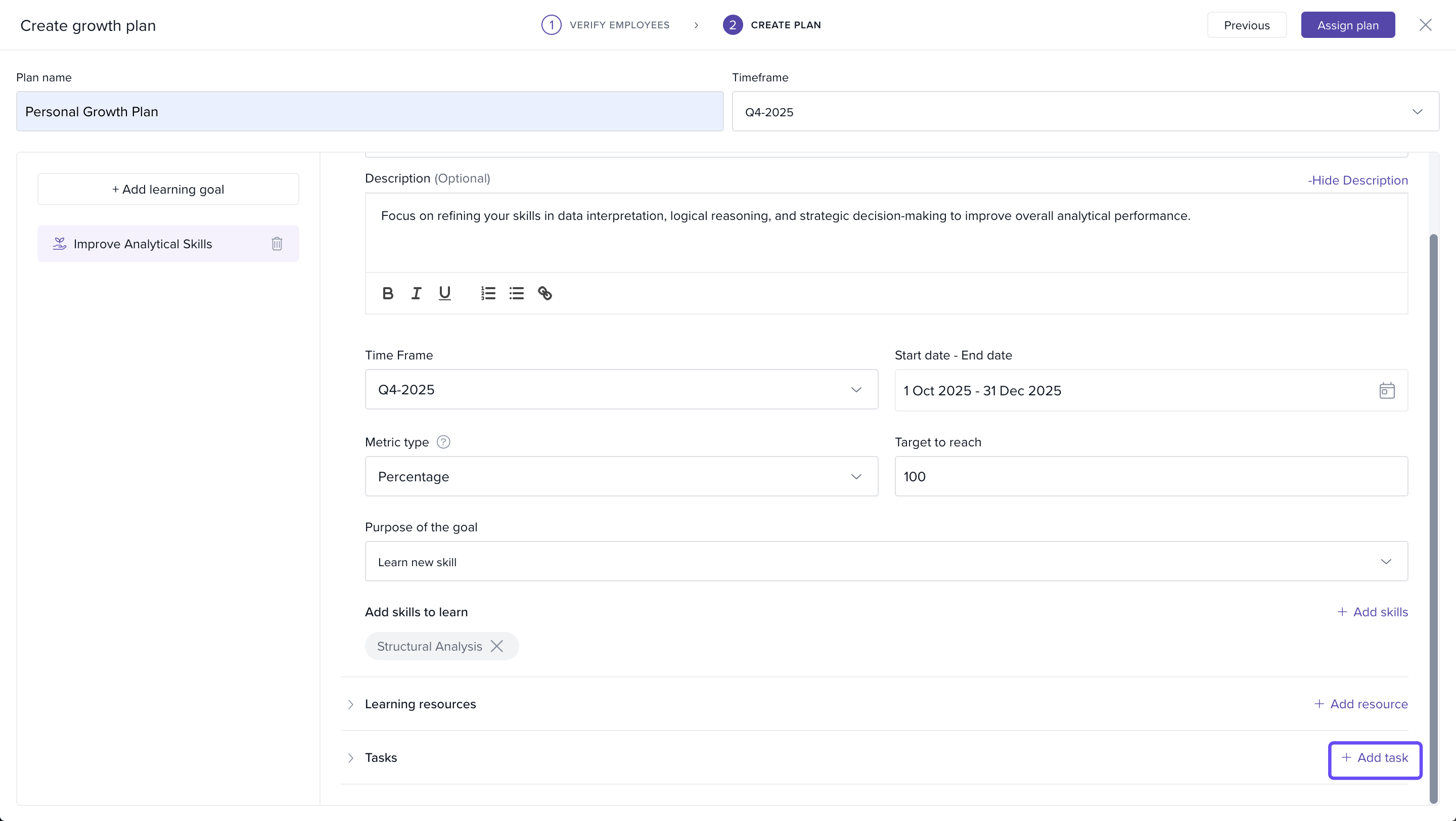 Click + Add task to define measurable activities within the plan and enter task details, including start and end dates.