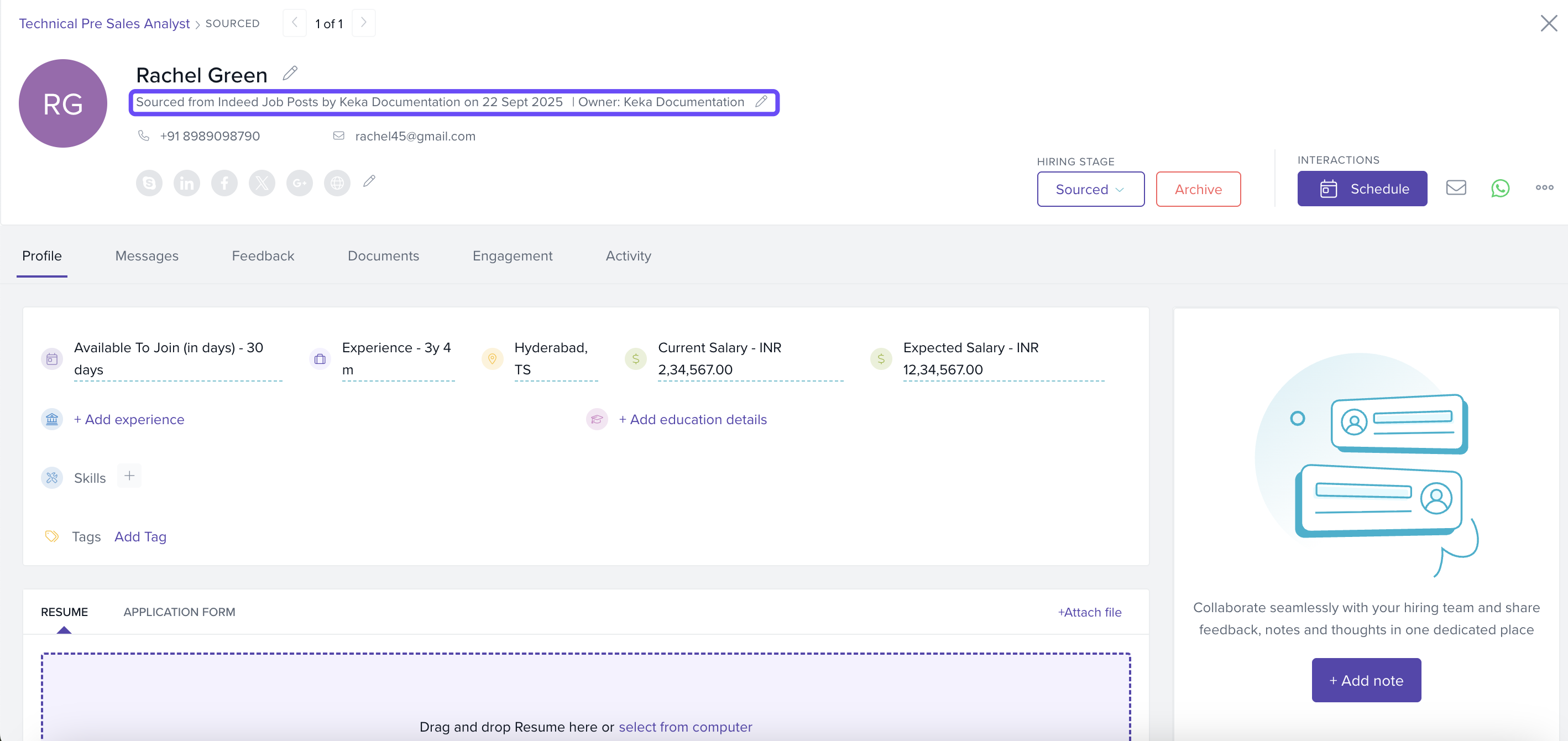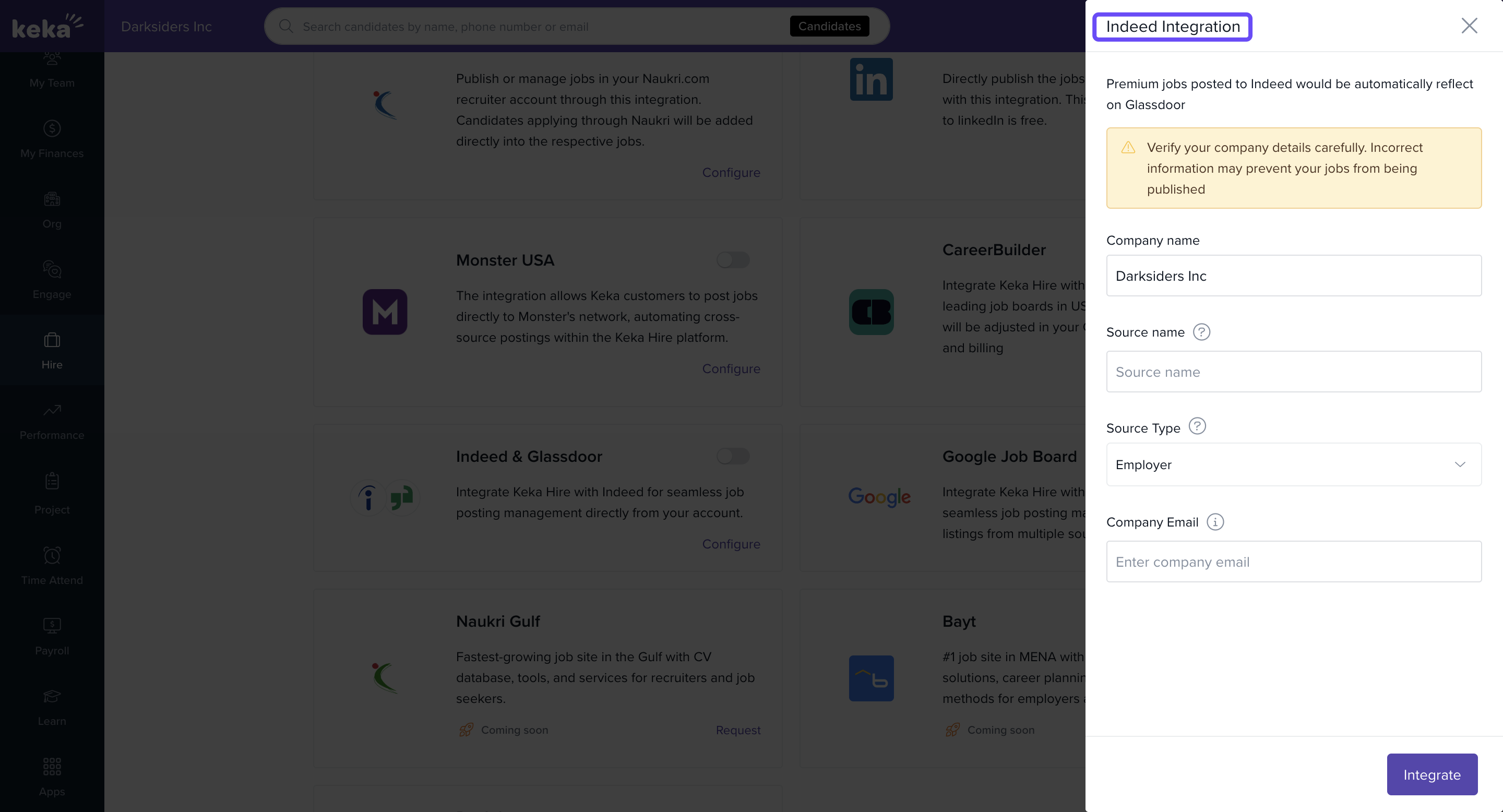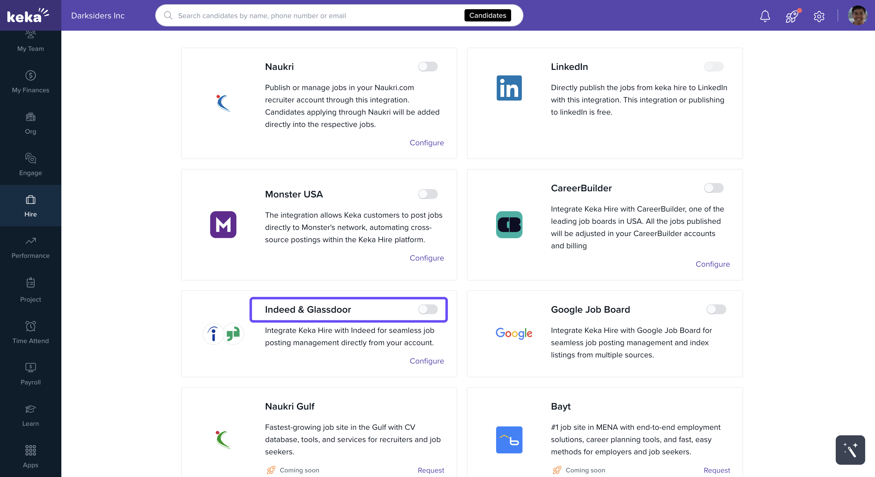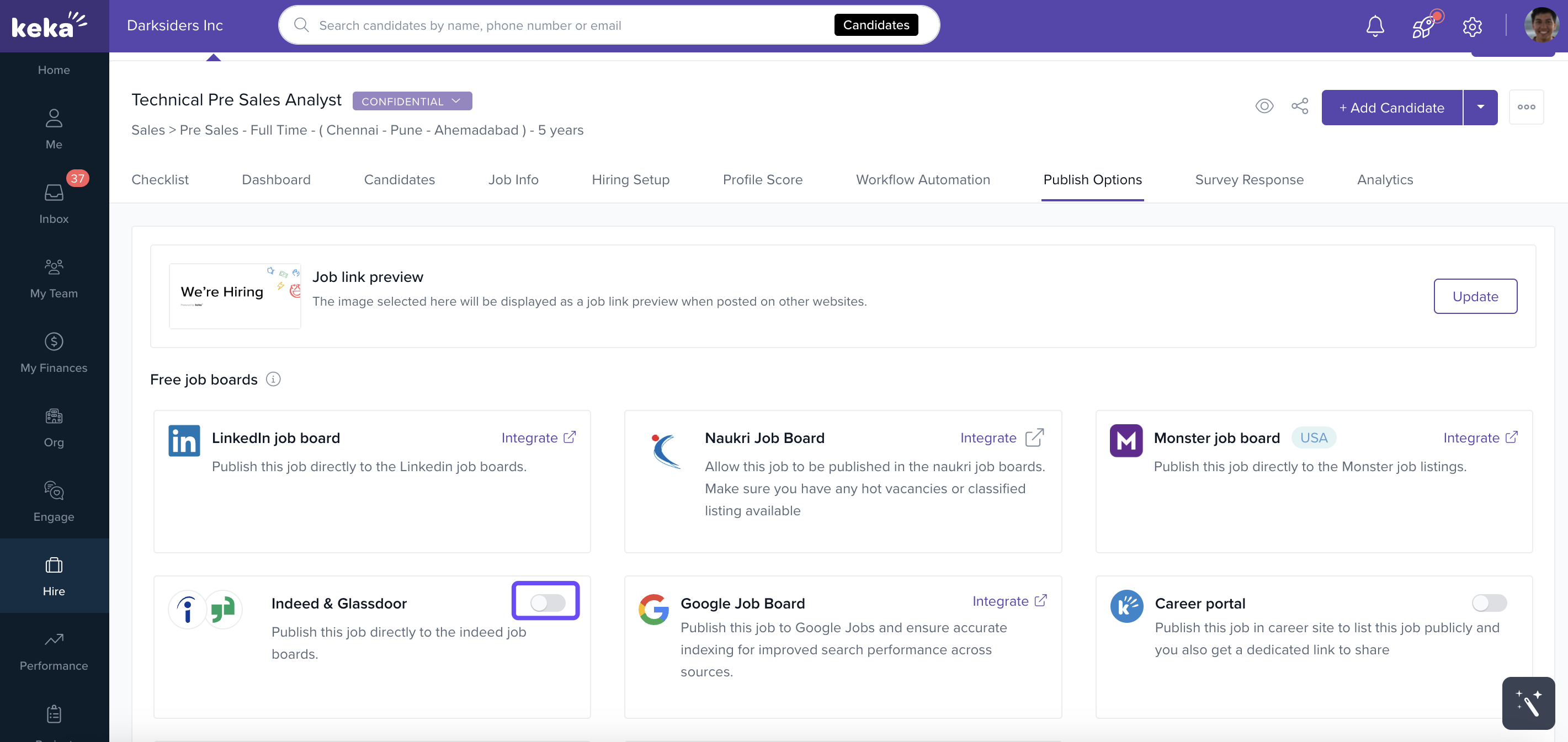 The Indeed integration in Keka Hire lets you post jobs directly to Indeed and manage applications seamlessly within your Keka dashboard. This helps you reach a wider talent pool, streamline your hiring, and centralize candidate data — all in one place.