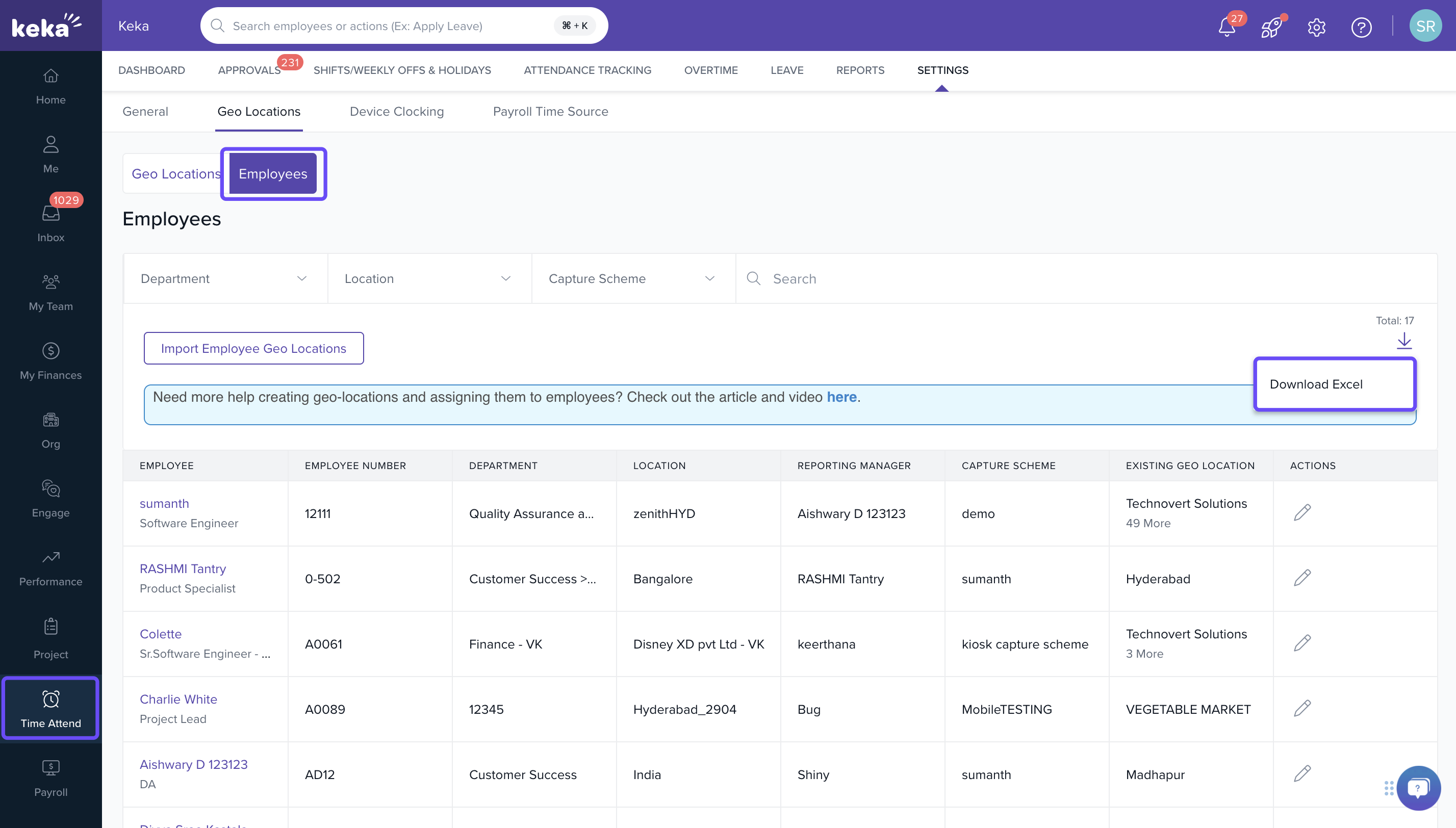 The report is downloaded in an Excel file with two sheets, helping admins efficiently manage and update employee geolocation data.