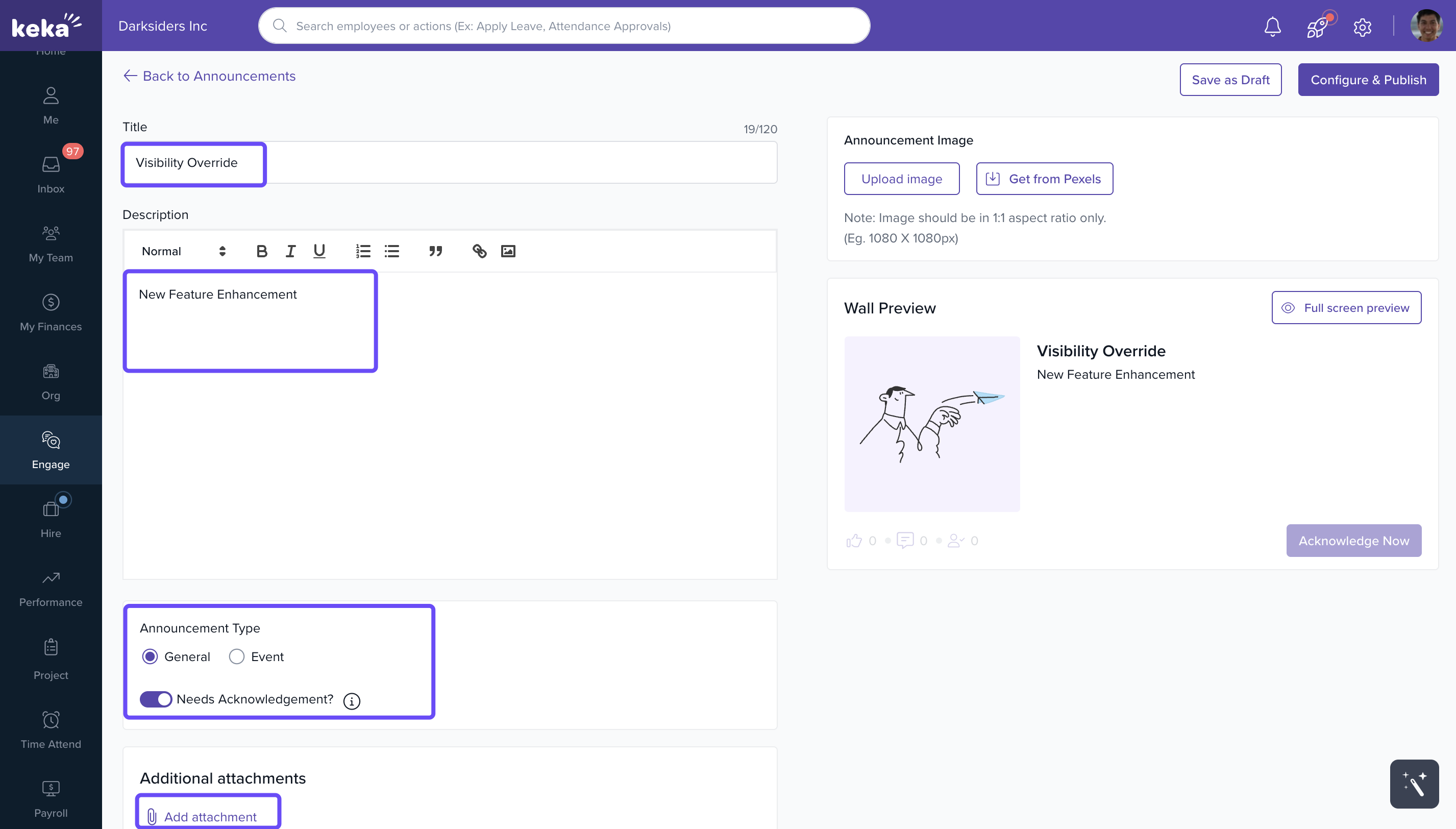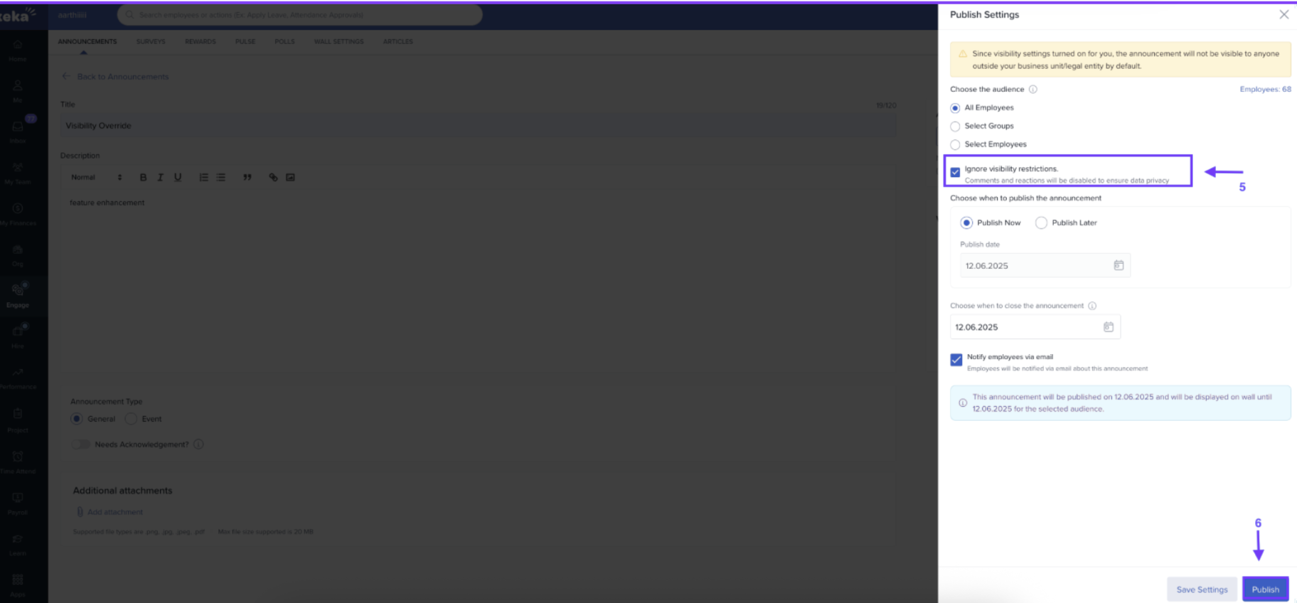 Keka gives Global Admins the ability to override default audience restrictions using the “Ignore visibility restrictions” feature when creating announcements. This ensures critical communication reaches all employees, instantly.