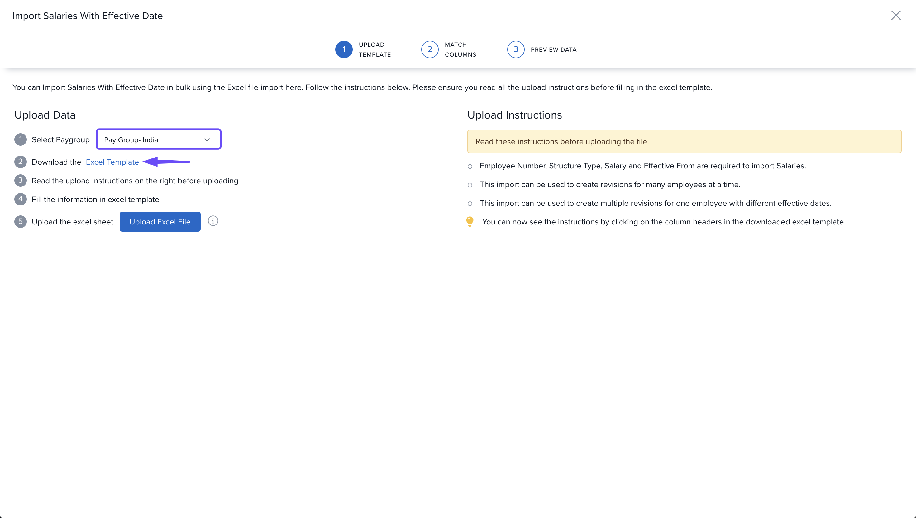 Click on the hyperlink to download the Excel template for uploading the revised salary data.