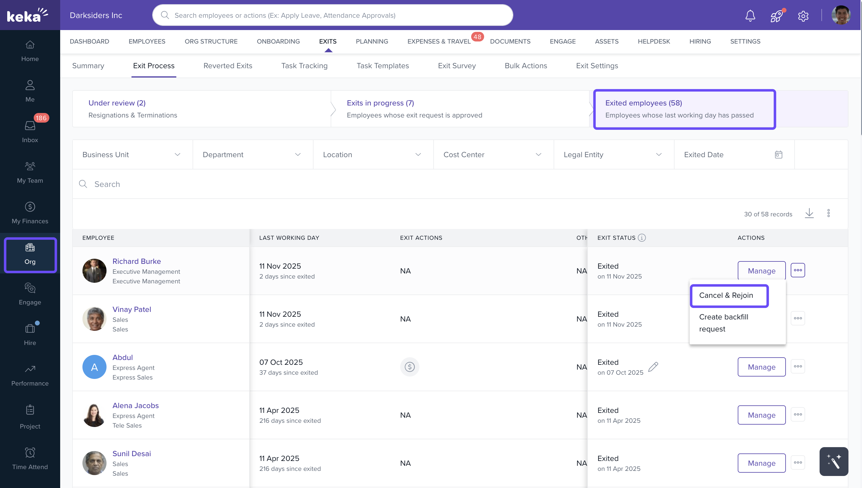 - Locate the employee you want to rehire, click on the three-dot menu under the Actions column, and select Cancel & Rejoin.