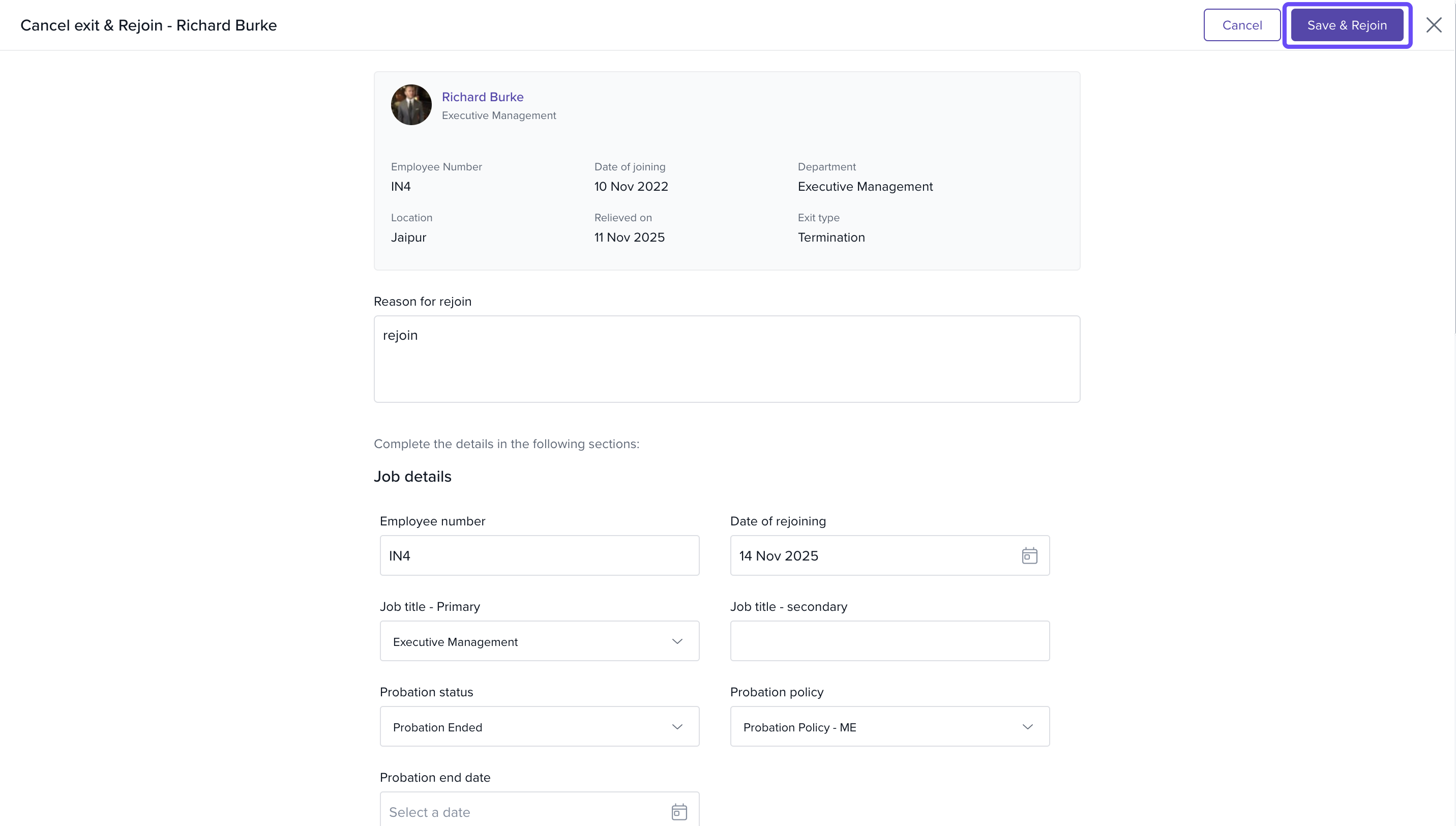 - In the Cancel Exit & Rejoin window, enter the Reason for Rejoin and fill in all necessary details.