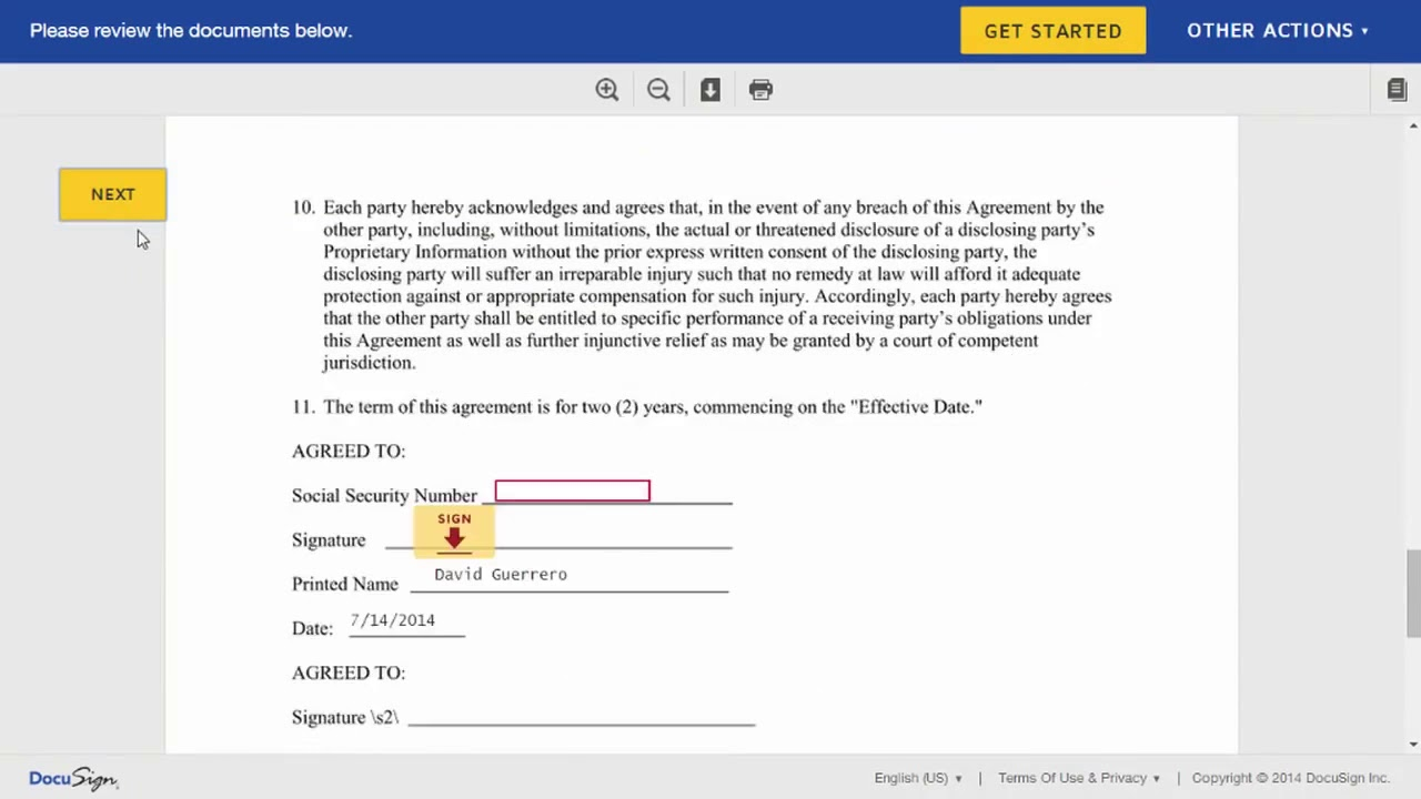 Once the workflow is configured, whenever a document is generated using this template, the designated signer will receive an email from DocuSign.