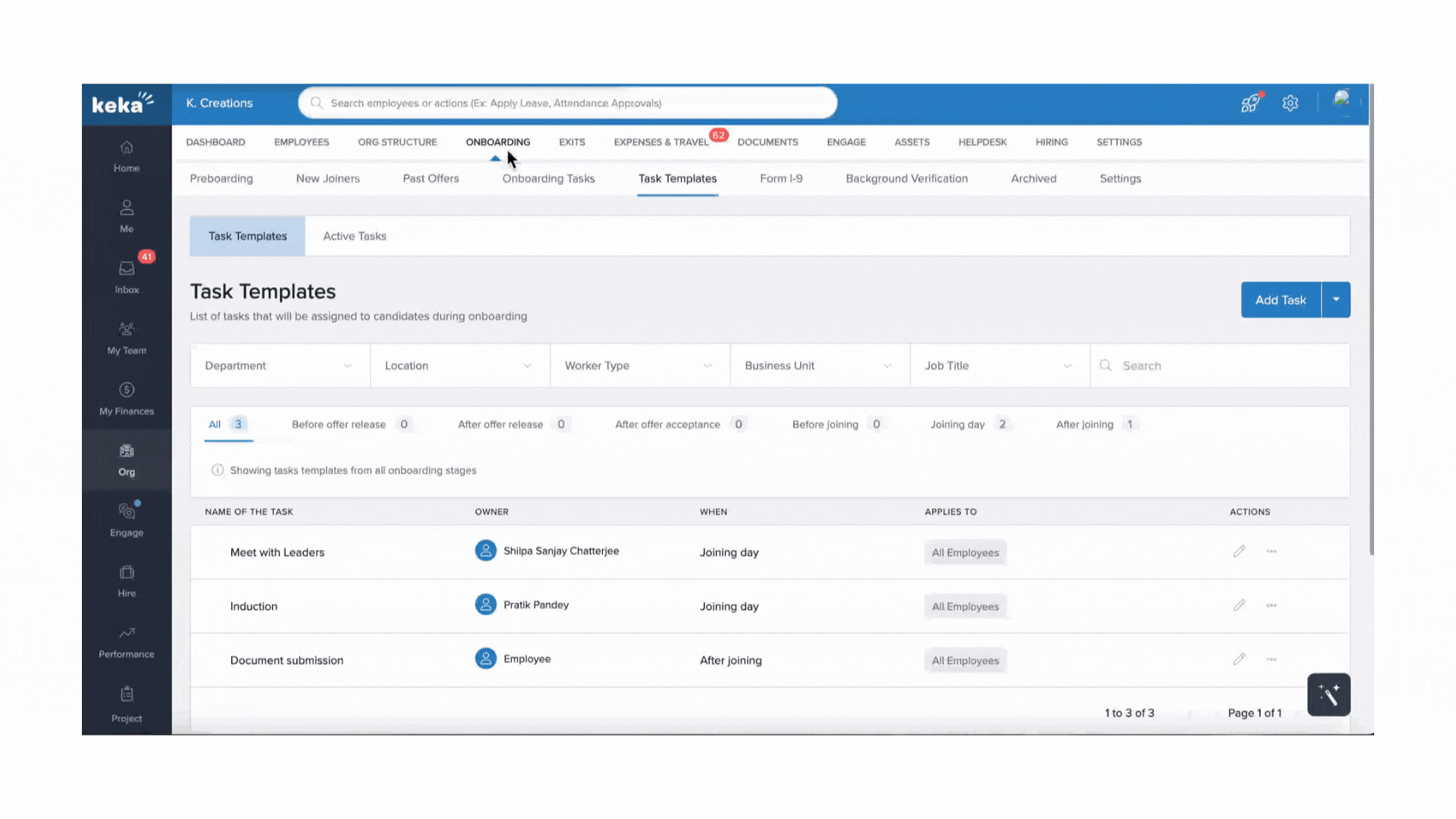 Once onboarding begins, Keka automatically assigns onboarding tasks to the relevant stakeholders. Typical onboarding tasks include: