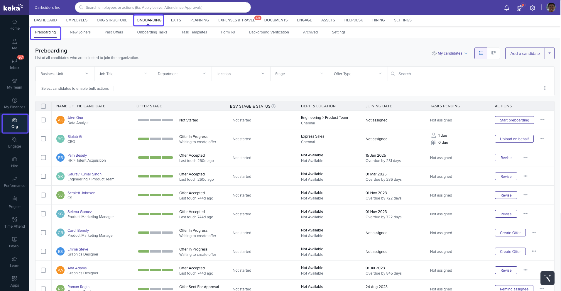 In Keka, the Preboarding stage lists all candidates who are selected but not yet added as employees. Candidates are categorized into different phases to track their progress: