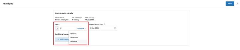 While adding or revising compensation for employees or contractors, users can define the pay structure based on a per piece or per unit rate.