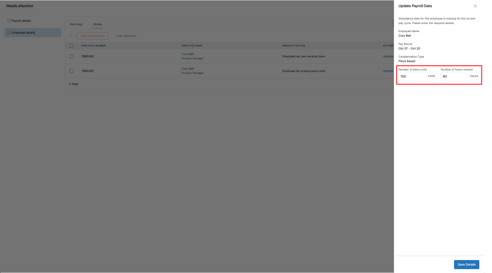 Before payroll is processed, users must input the number of pieces/units worked during the payroll cycle. This can be done manually or by importing data.