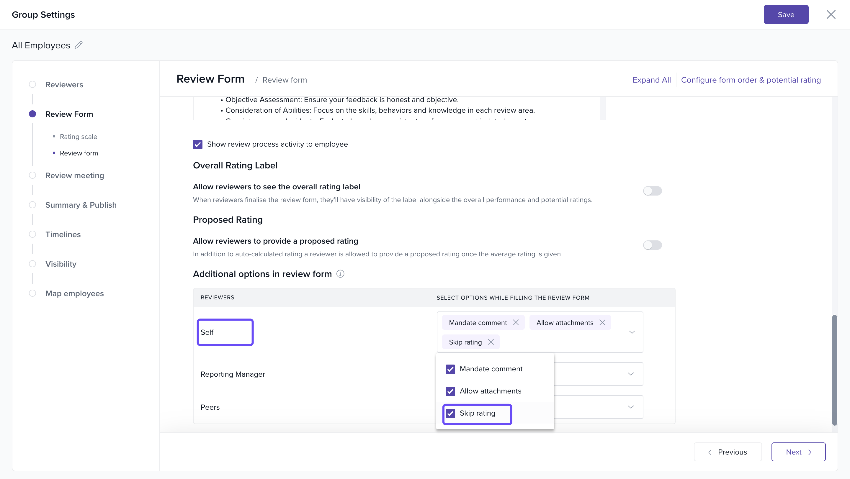 Next to the reviewer type (e.g., Self), toggle Skip Rating on or off as needed.