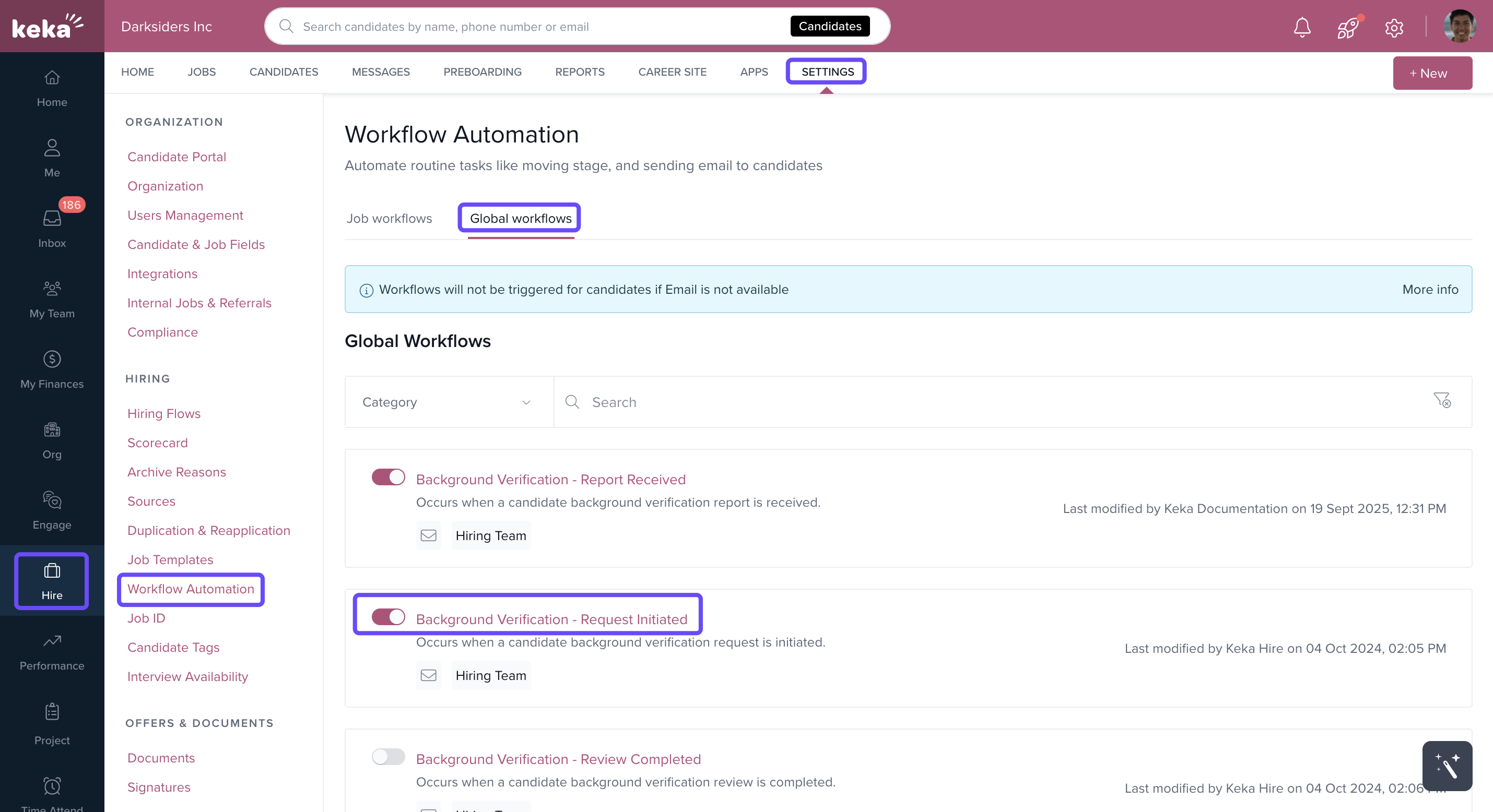 In any recruitment process, it’s important to keep the right people informed about candidate updates. With Keka Hire, you can now set the Candidate Owner as a recipient in workflow automations. This ensures that the person managing a candidate is automatically notified when key actions occur—helping streamline follow-ups and decisions.