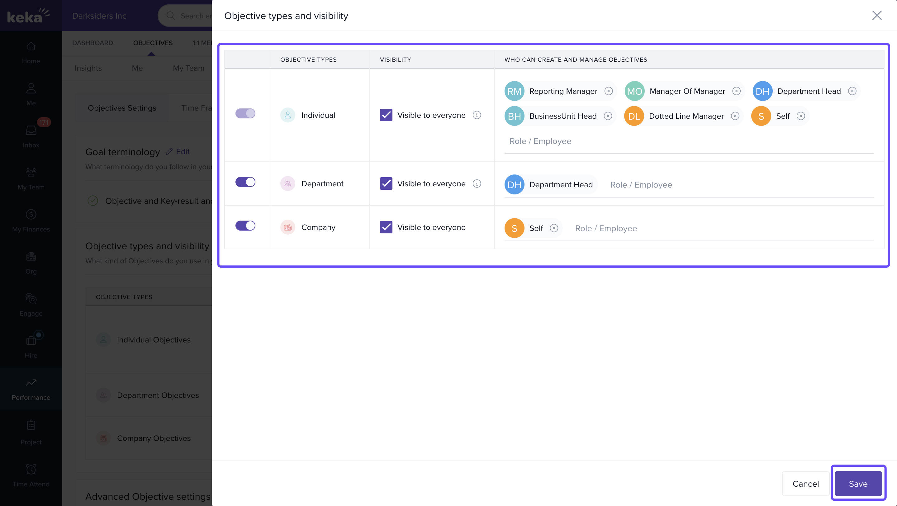 Keka allows you to define different types of goals—Individual, Department, and Company-level—and control their visibility. Making objectives visible to everyone in the organisation improves alignment, boosts transparency, and fosters collaboration across teams.