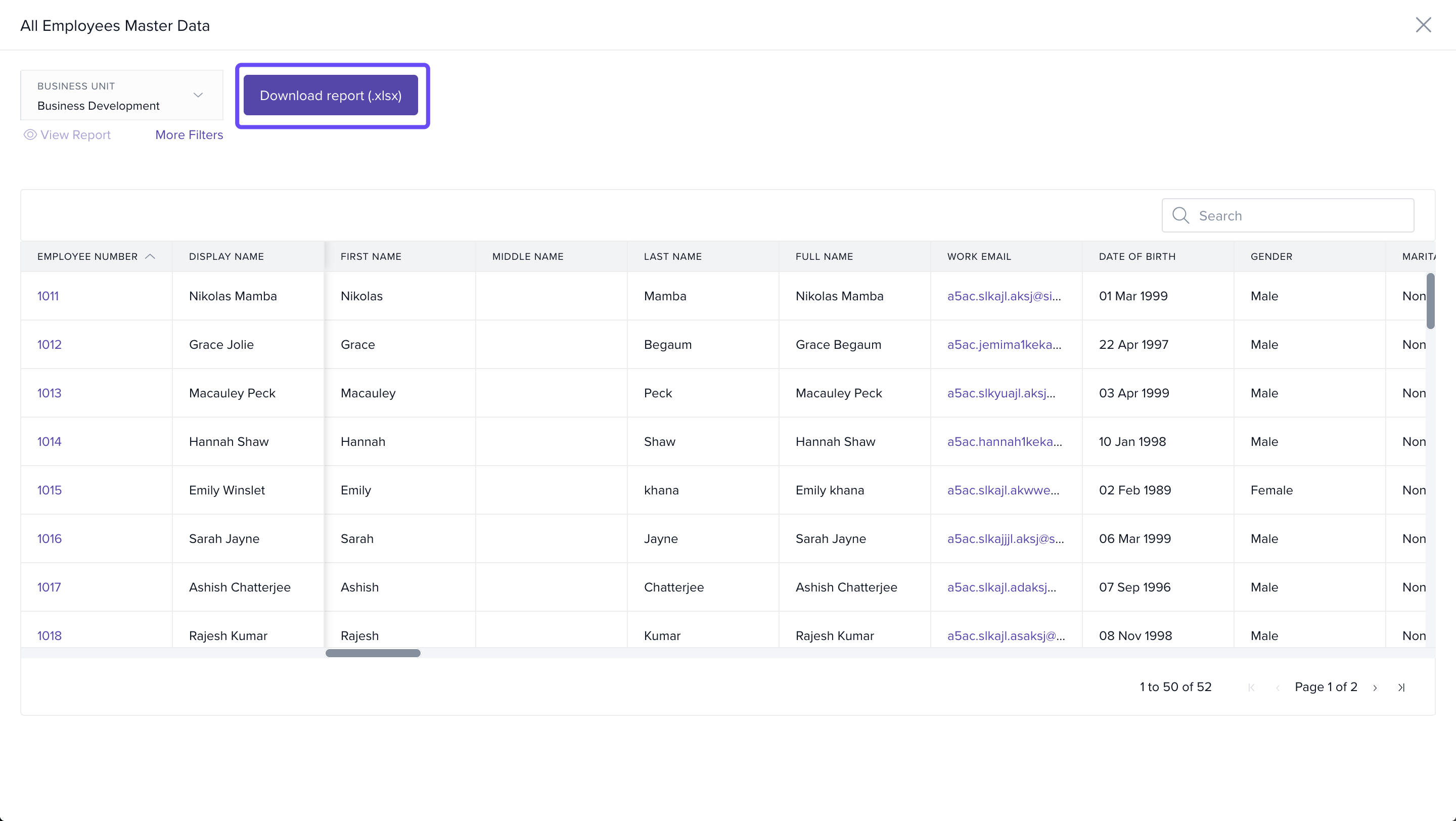 - On the All Employees Master Data page, select the Business Function and other required filters and click View Report.
