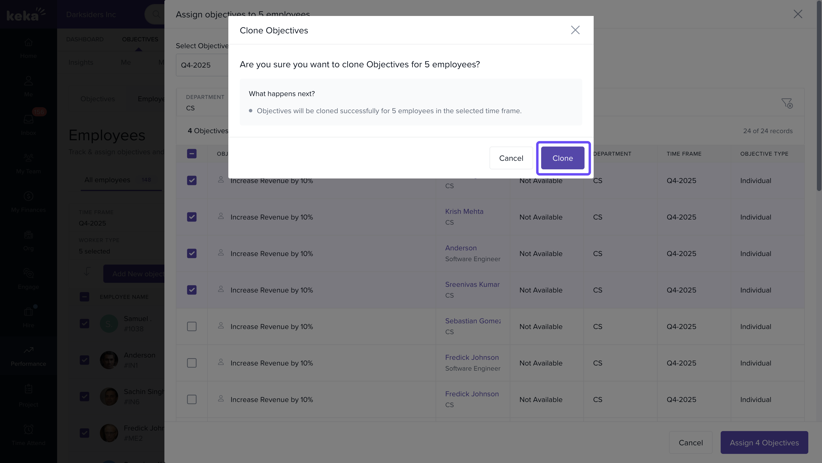 - Check the boxes beside the employees for whom you want to clone objectives.