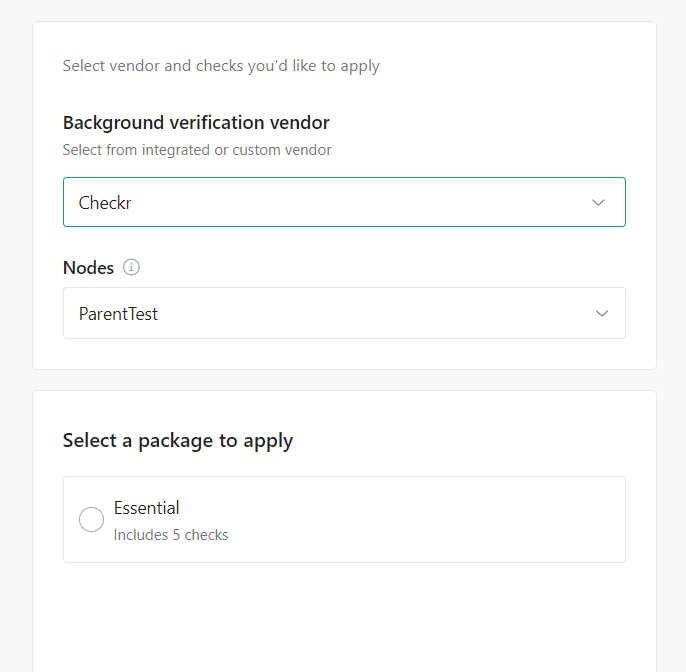 The integration allows users to configure "nodes" within their Checkr account, which appear when ordering a background check. Nodes can be used to represent different locations, teams, or groups within your organization that request background checks. After creating nodes, you must assign packages to them. Checkr invoices will detail which node ordered which package.