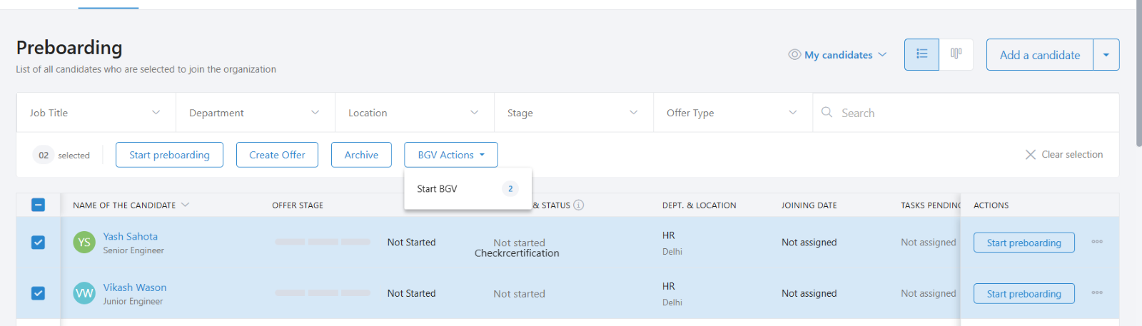 To process background check in bulk, select candidates and choose Start BGV under BGV Actions.