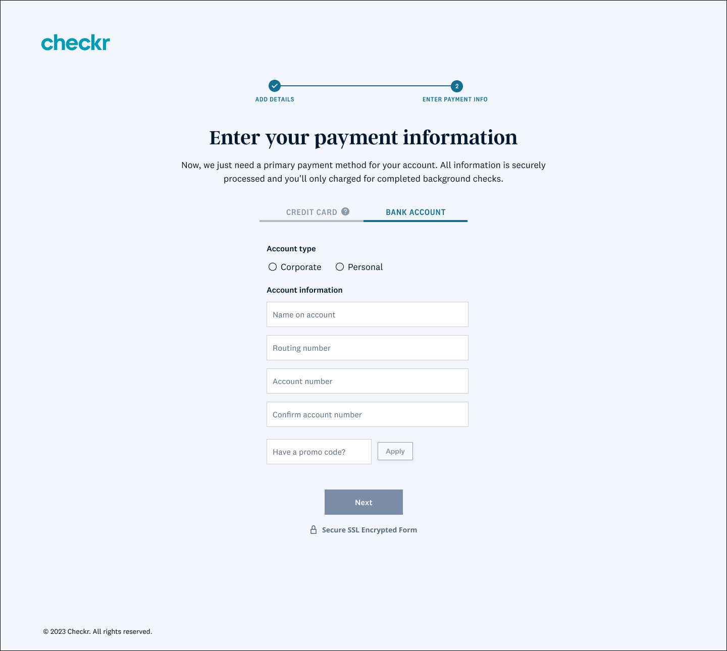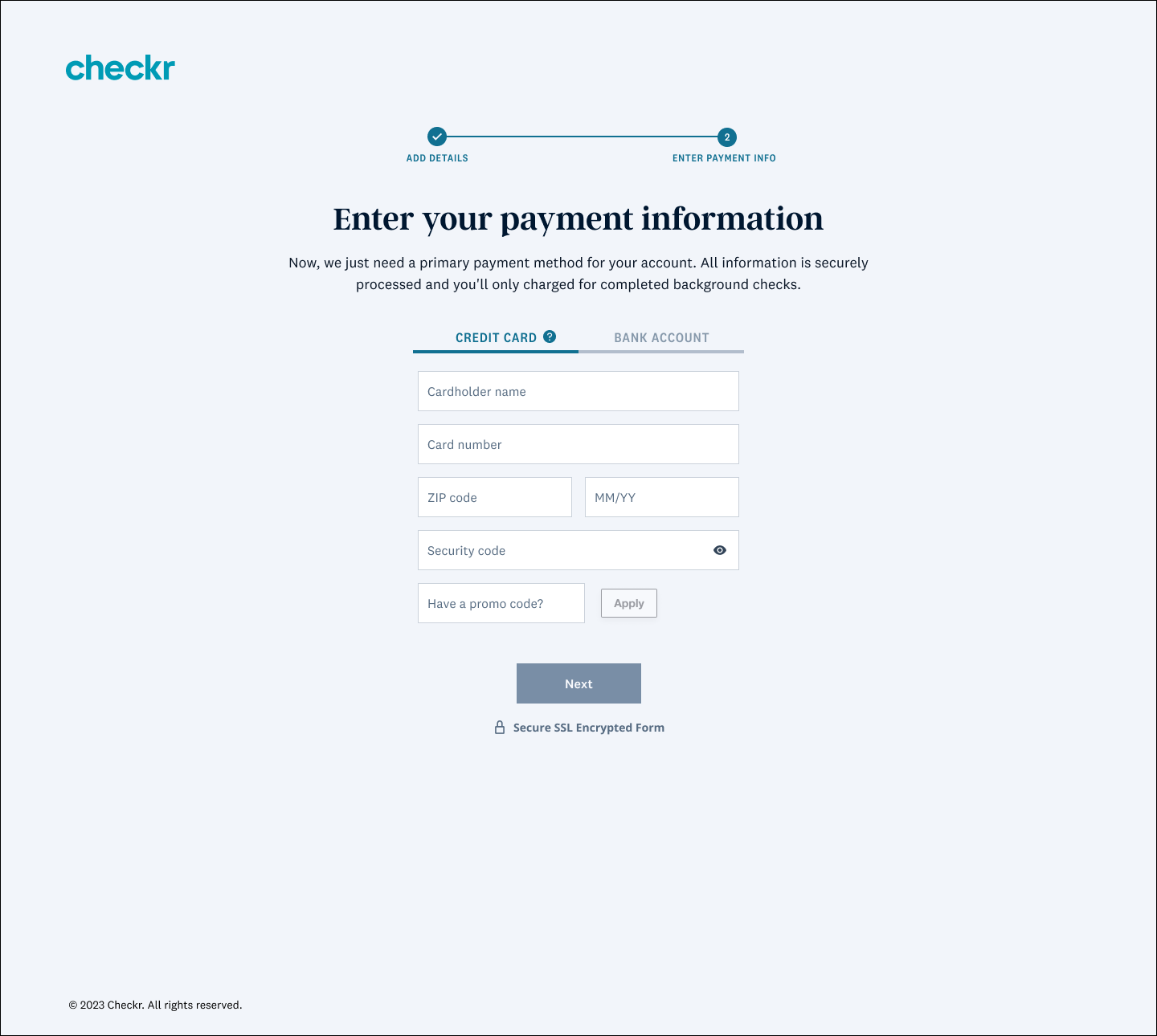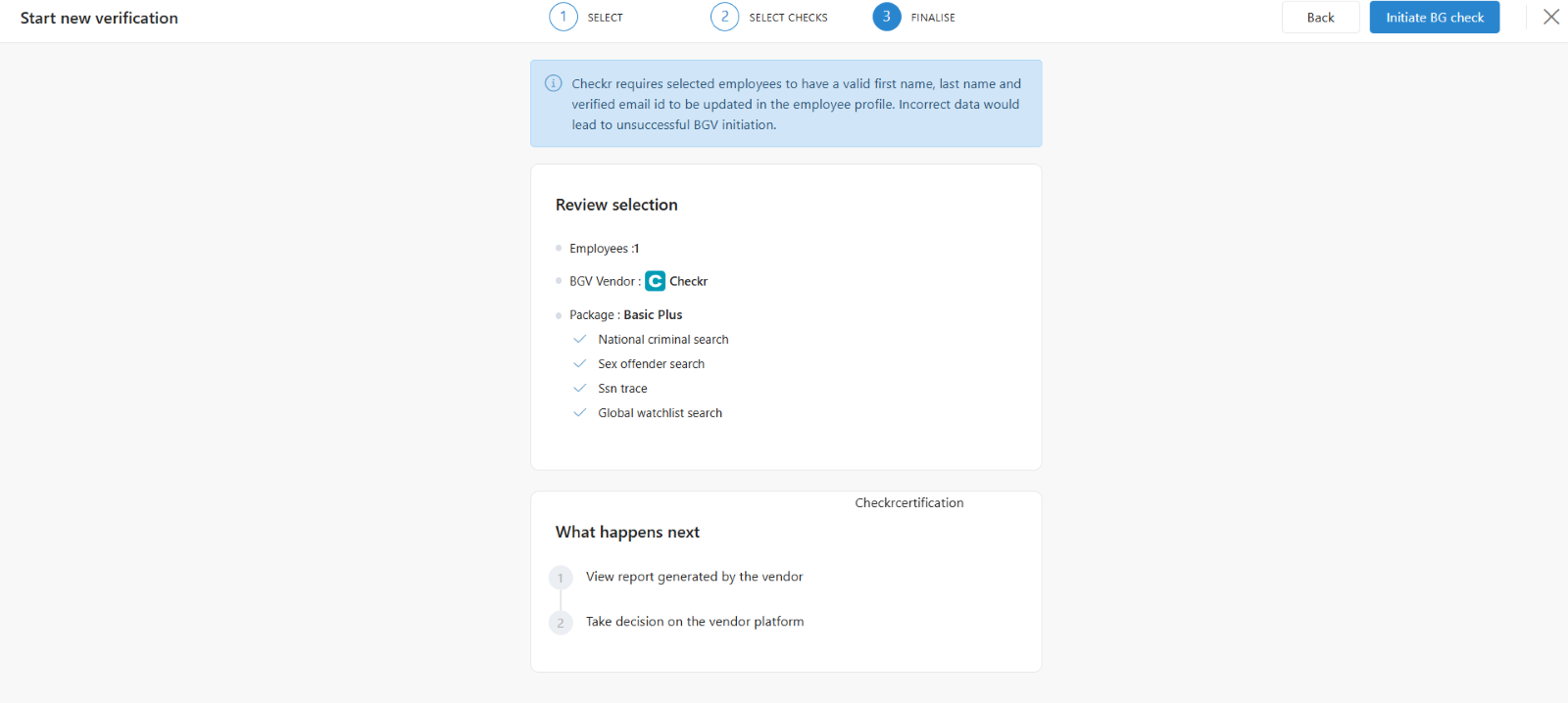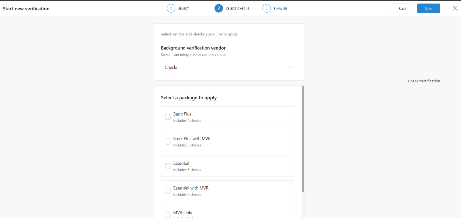 Choose Checkr as your vendor and select your preferred background check package. Click “Next.”
