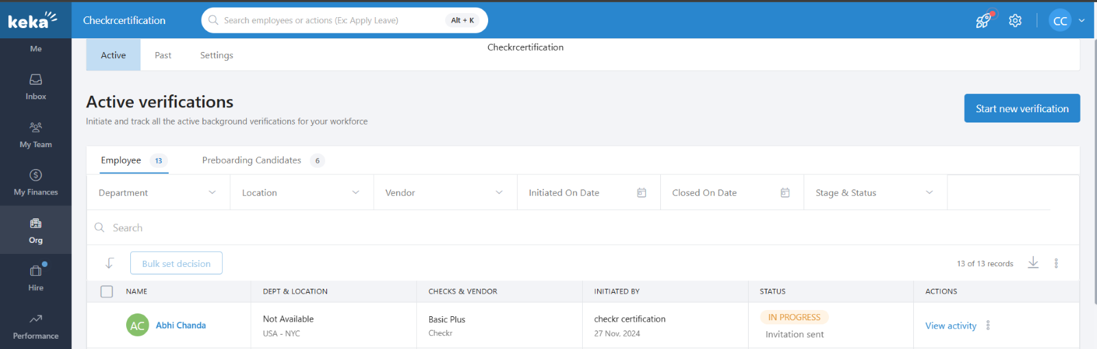 With Checkr integrated into Keka HRMS, managing background verification is now seamless and efficient. This guide will help you set up the integration, order background checks, and track their progress—all from within the Keka platform. Simplify your processes and experience hassle-free BGV management like never before!