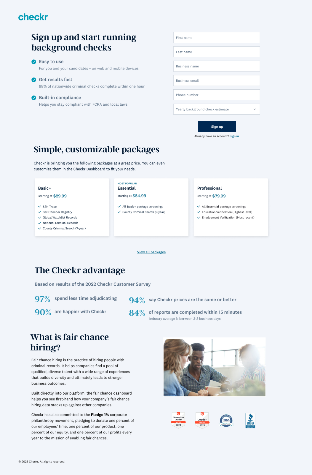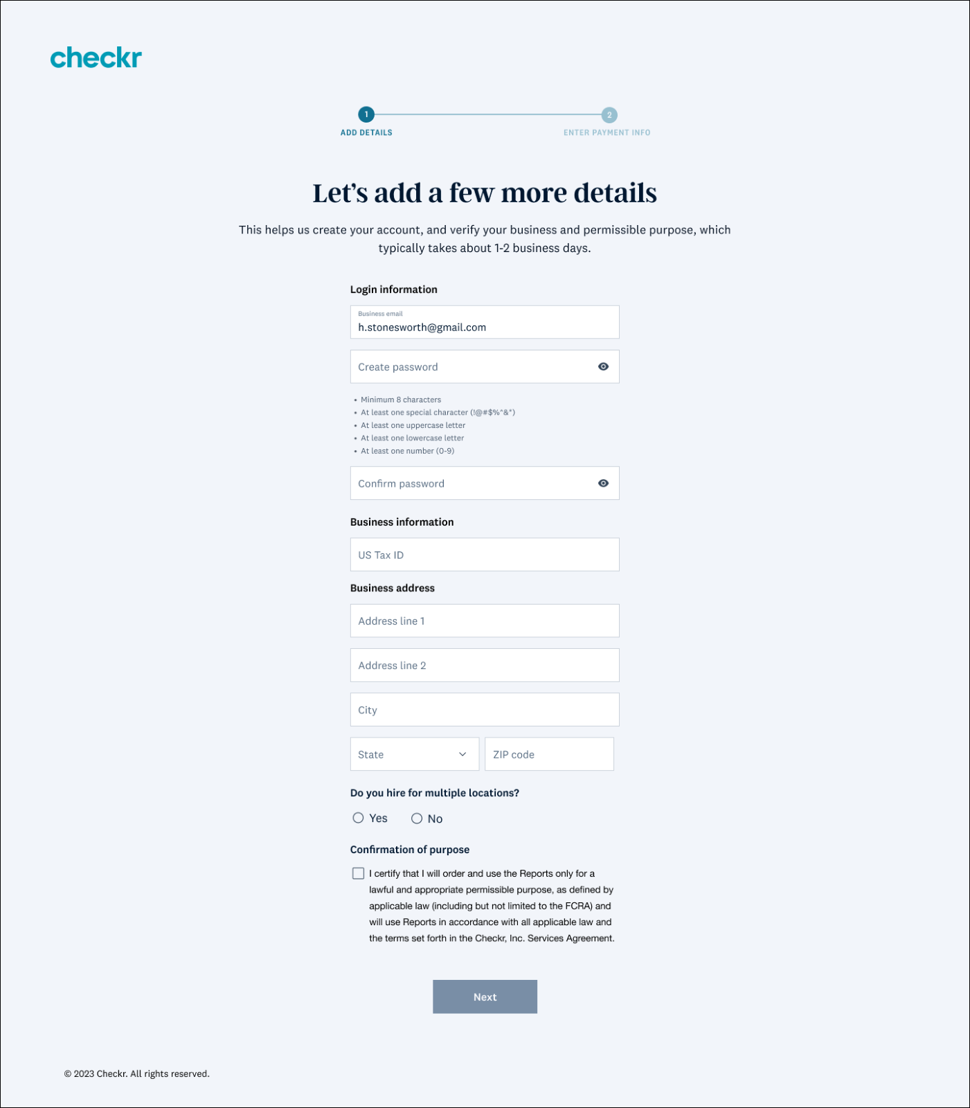 - New Checkr Customers: Fill in the required details, select Sign Up to create a new Checkr account, and provide your company information.