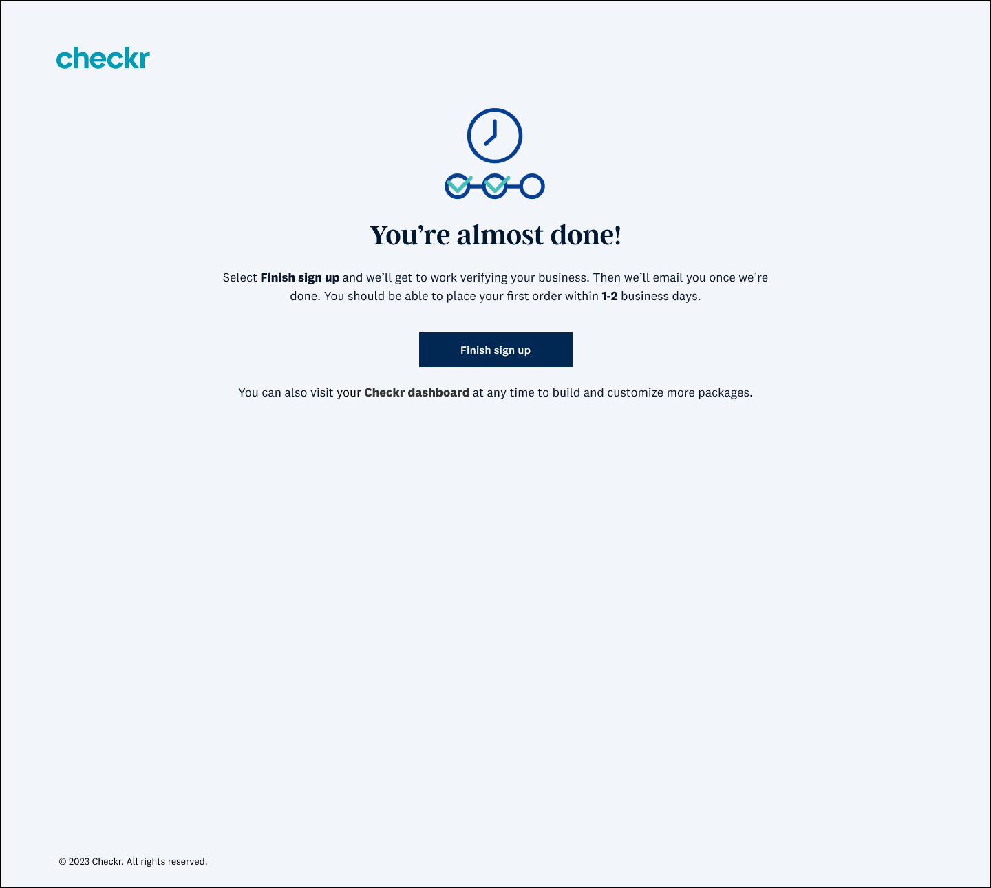 Click Finish Sign Up to submit your account to Checkr for review. Once the credentialing process is complete, Checkr will notify both you and Keka, enabling you to start syncing background check data through the Keka platform.