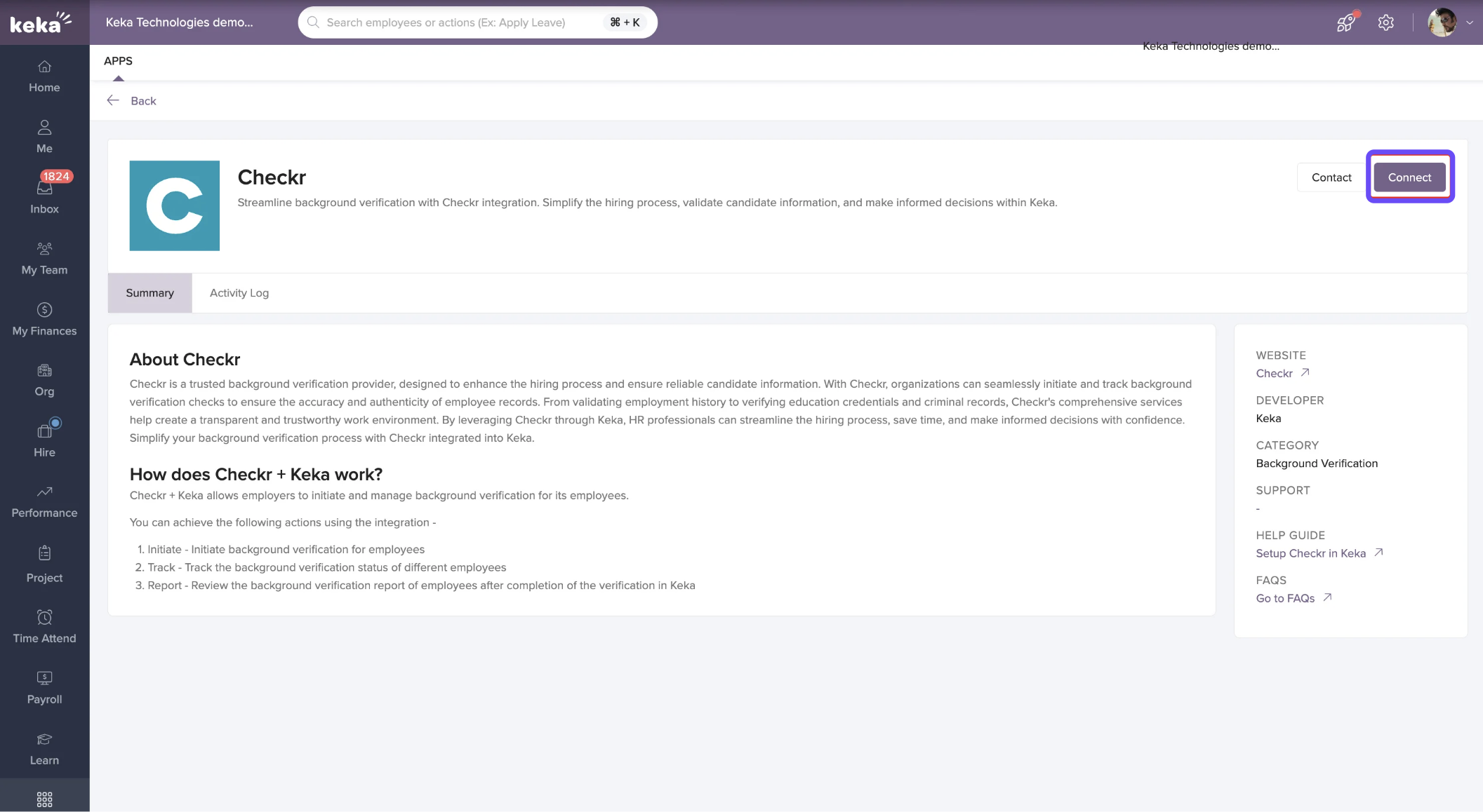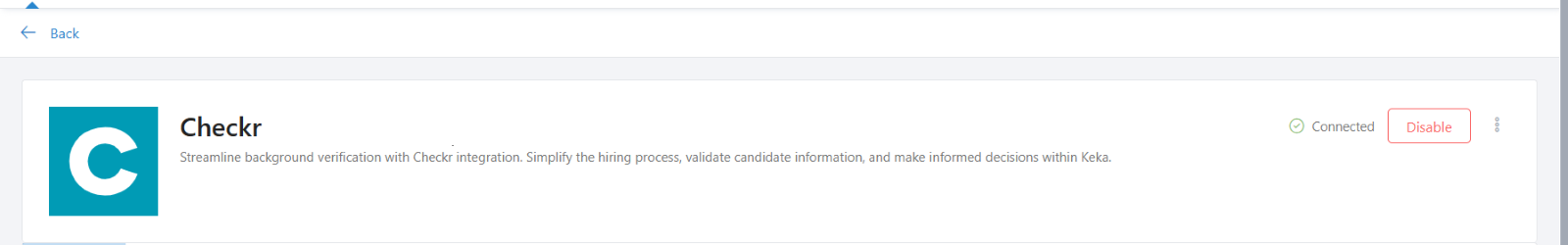 After completing the process, you will be redirected to the Checkr page within Keka, where the connection status will be displayed.