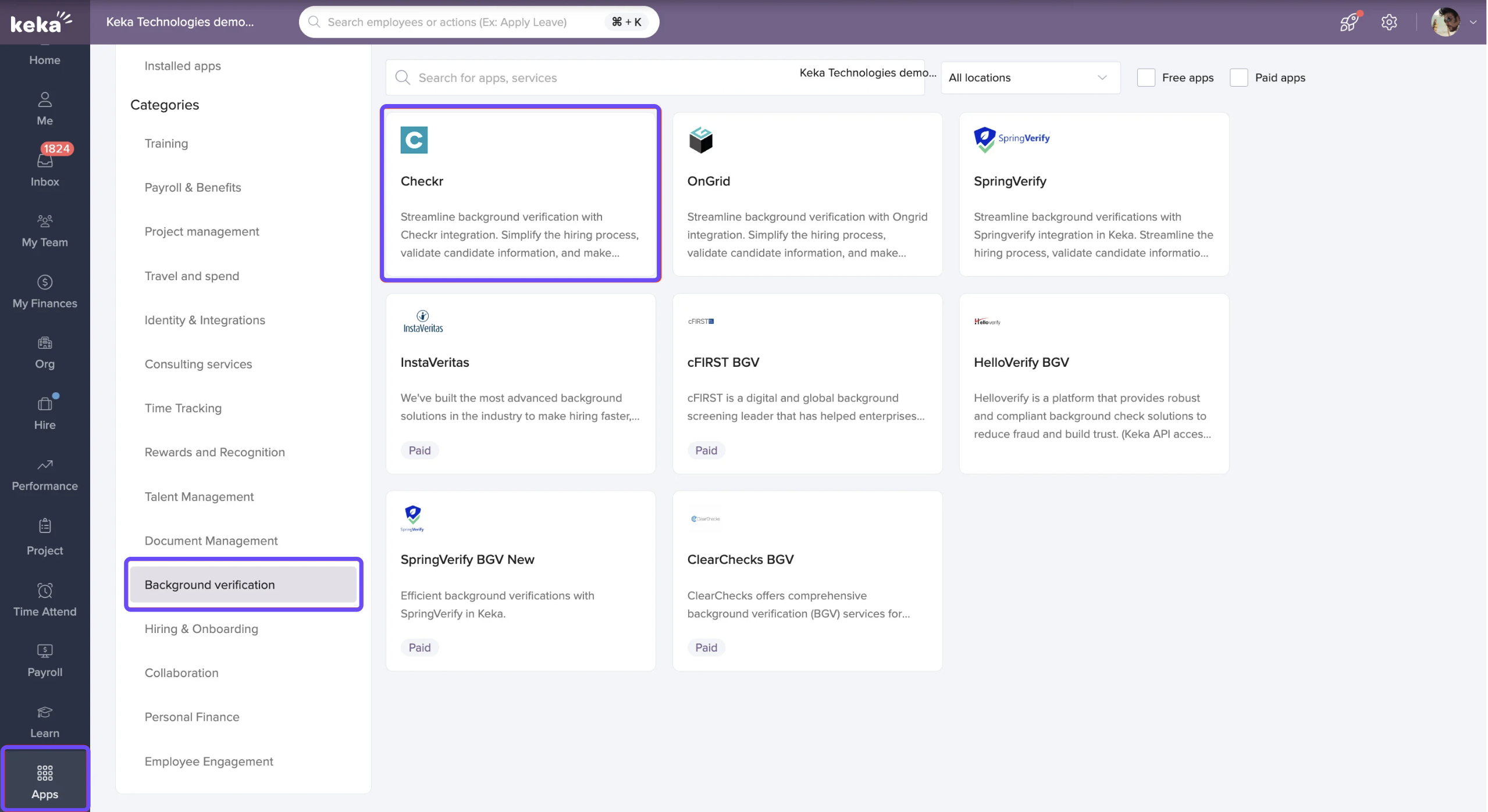 Log in to your Keka portal and navigate to Apps from the left navigation pane select Background verification section. Here, look for the Checkr tile and click on it to open the Checkr informational page.