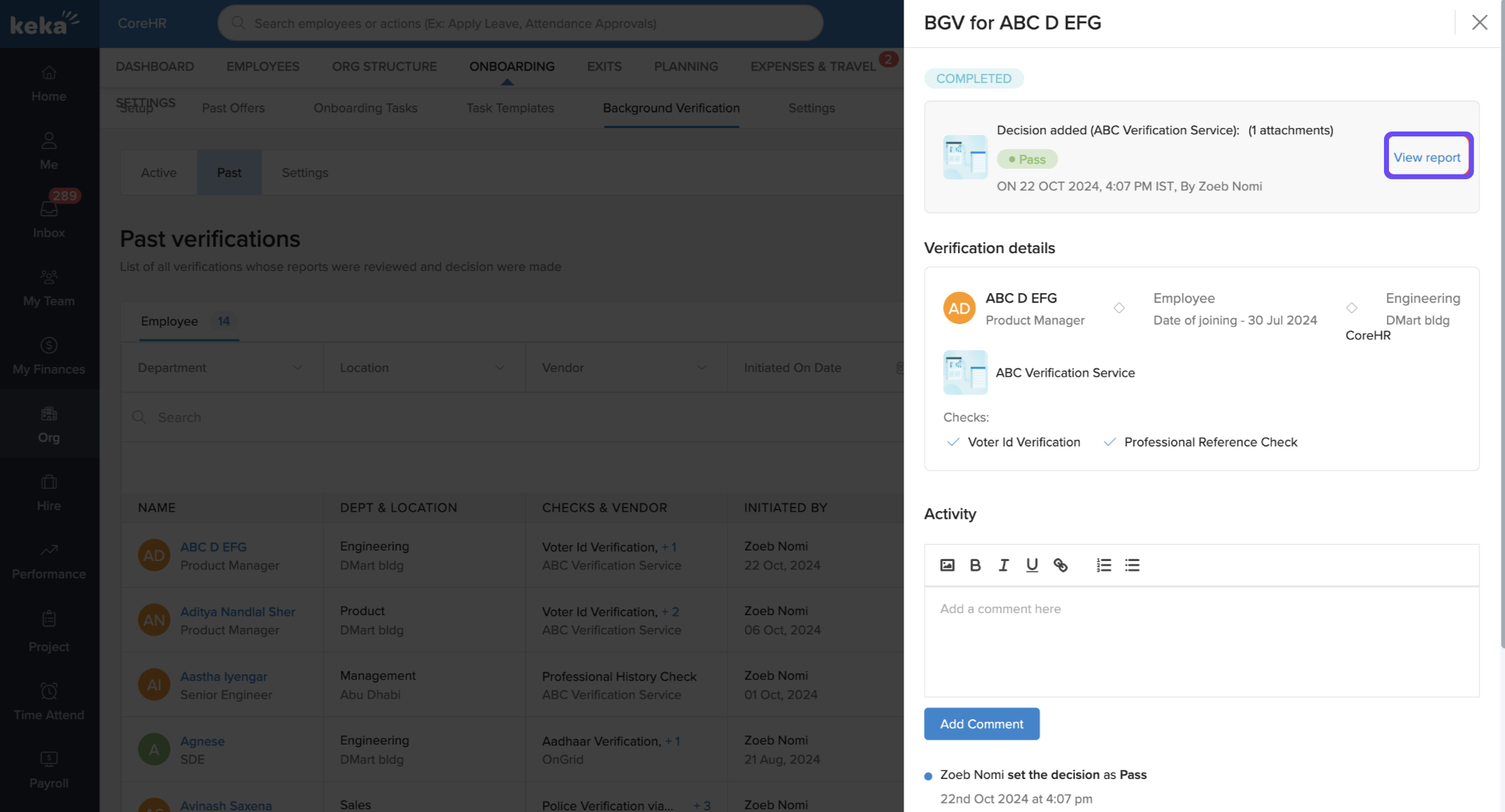 Once you click on the "View Report" button under the Preboarding or Background Verification tab, you will be redirected to the Checkr portal, where you can view the report and take adverse action if required.