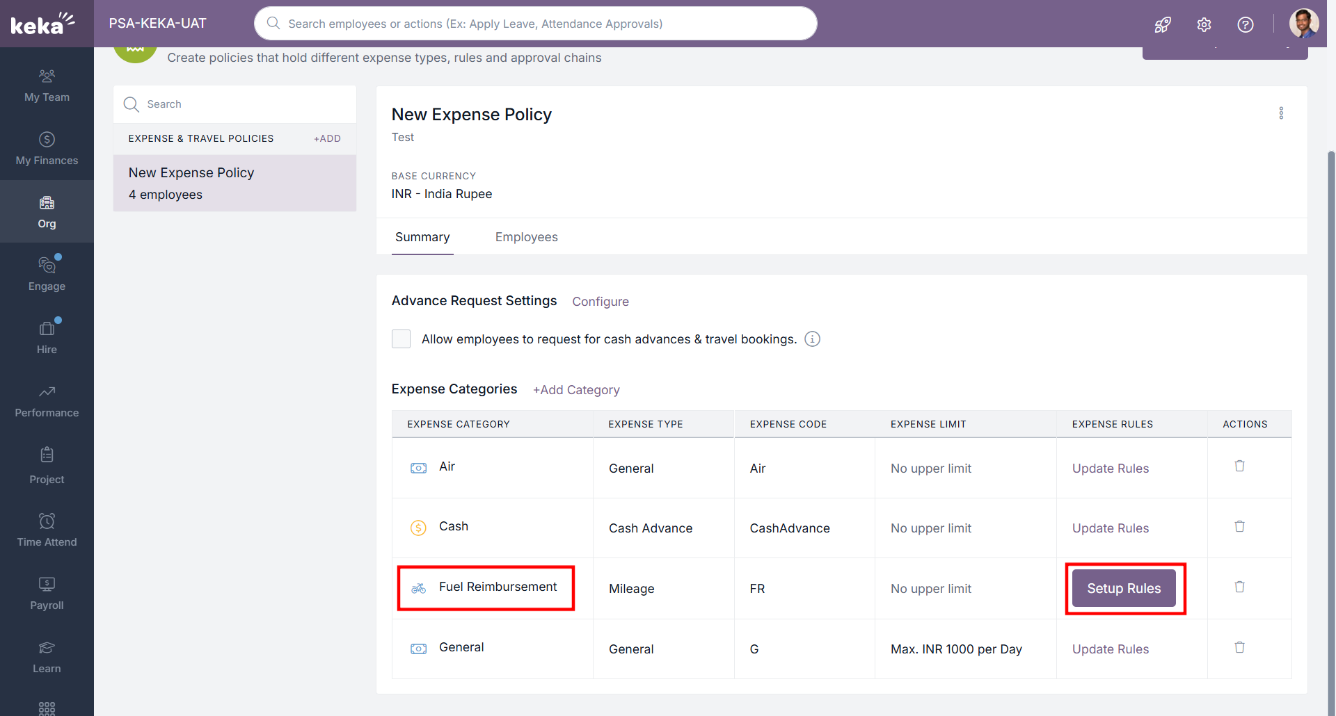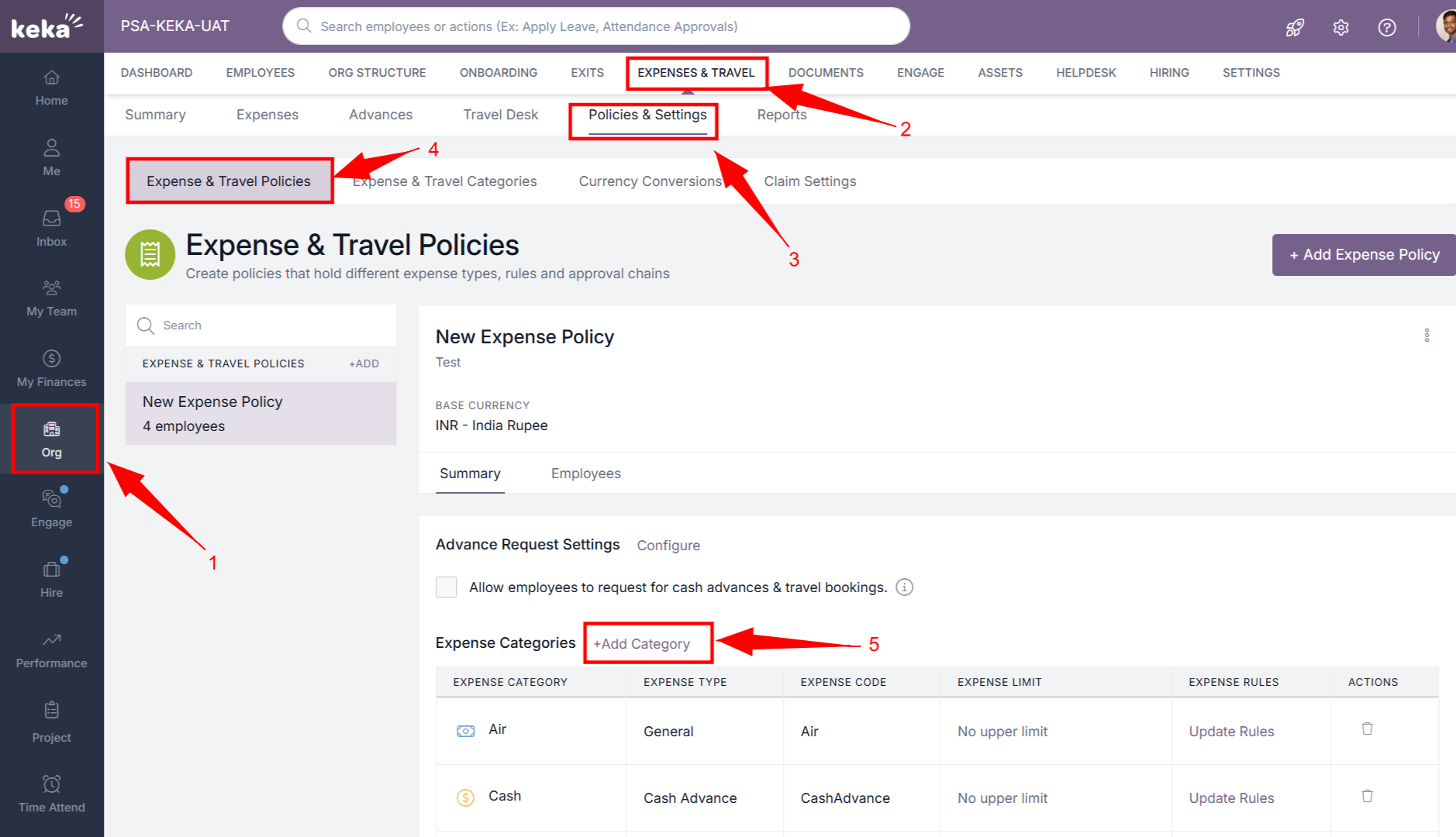 Begin by adding the Fuel expense category to your Expense Policy. To do this, navigate to the Org (1) and select Expenses & Travel (2). Next, click on Policies & Settings (3), followed by Expenses & Travel Policies (4). Then, choose the relevant expense policy, and then click on the +Add Category (5) under expense categories to continue.