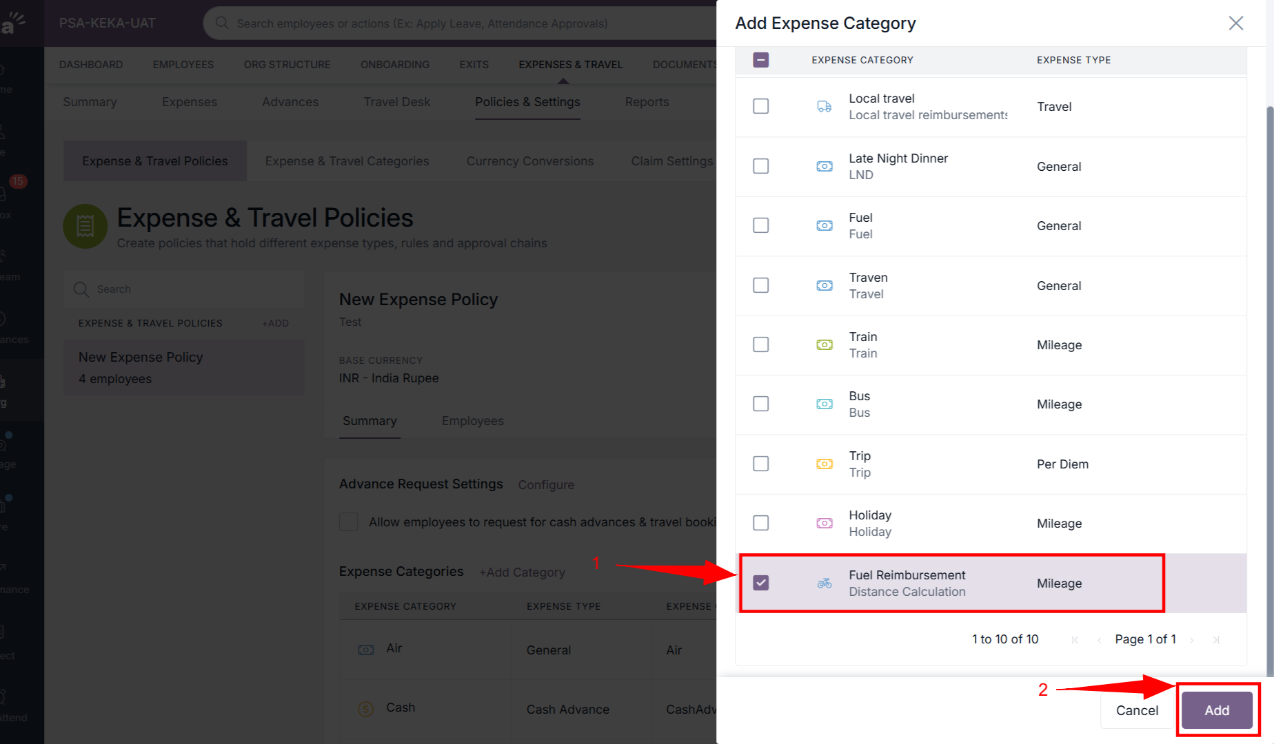 Select the Fuel Reimbursement (1) option from the list of previously added expense categories, and then click on the "Add" button (2) to include it in your policy.