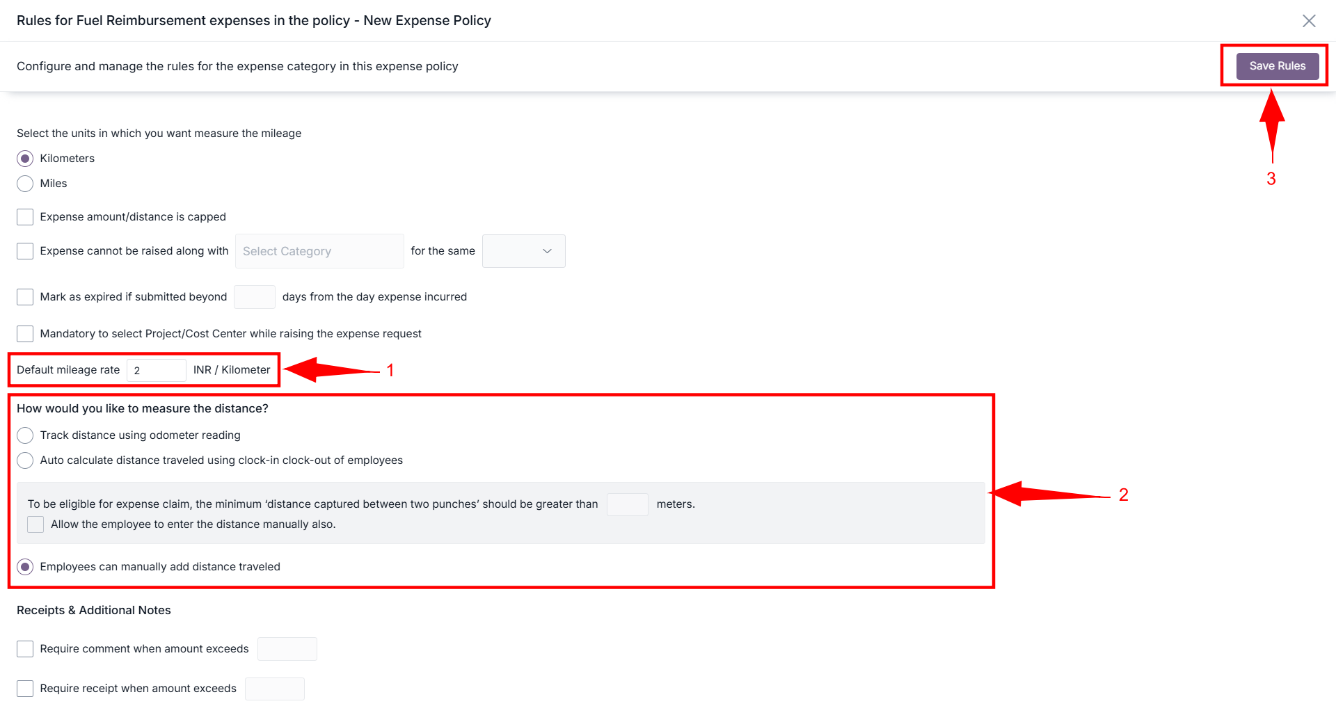 On this page, you can customize various settings according to your preferences. For instance, you can select the units for measuring mileage, set caps on the amount or distance, and establish any necessary restrictions. Additionally, enter the Default Mileage Rate (1) and choose your preferred Method for measuring distance (2). Once you have completed all the configurations, click on Save Rules (3) to finalize your settings.