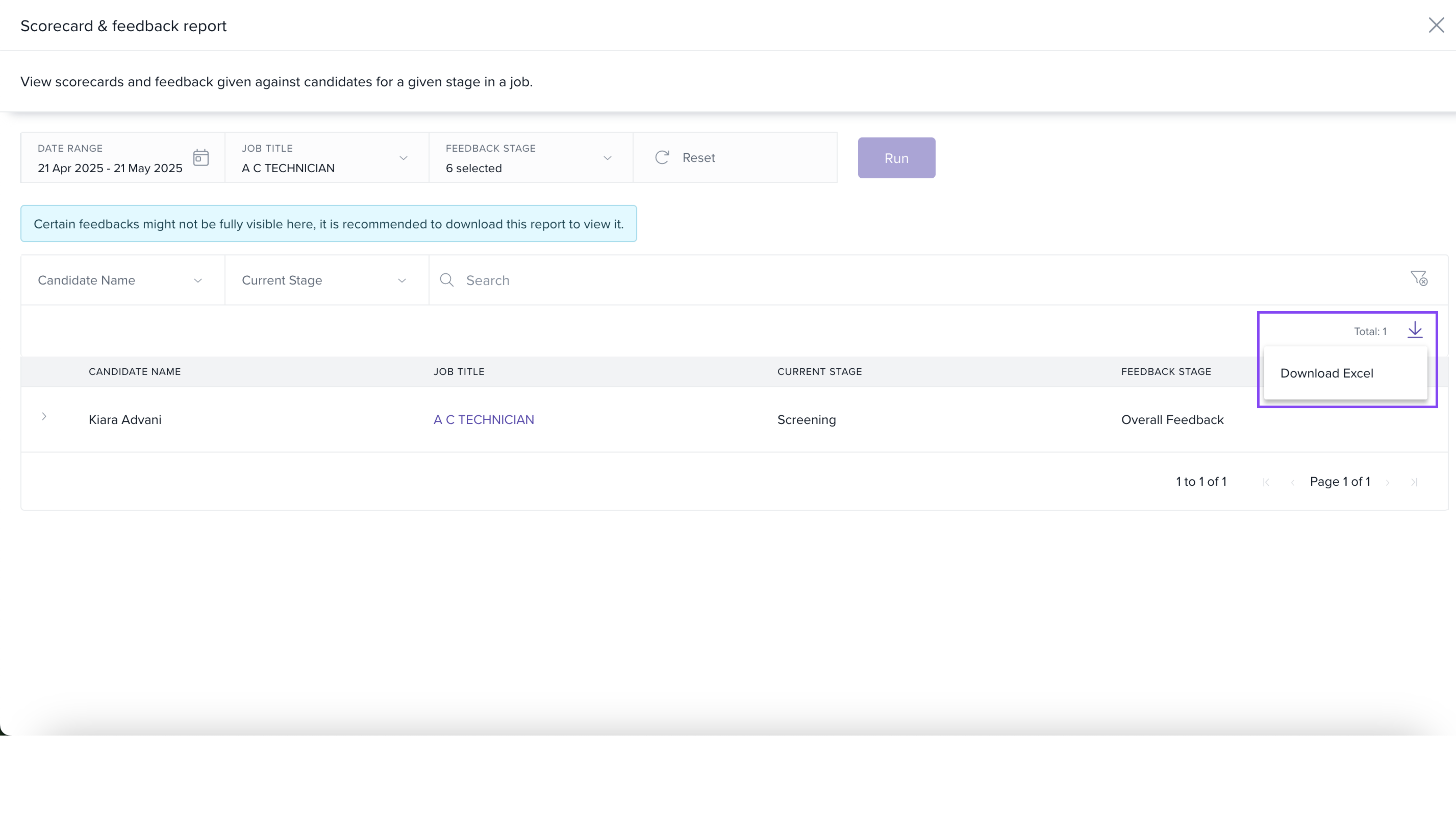 The report can be filtered based on job title, feedback stage, and date range, making it simple to download exactly the data required.