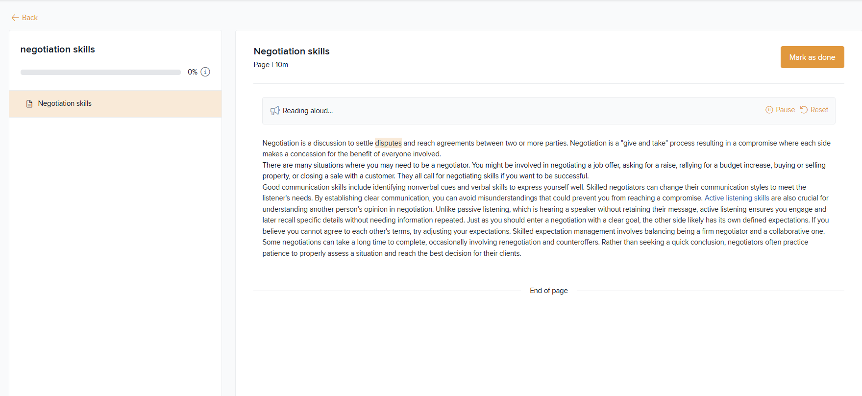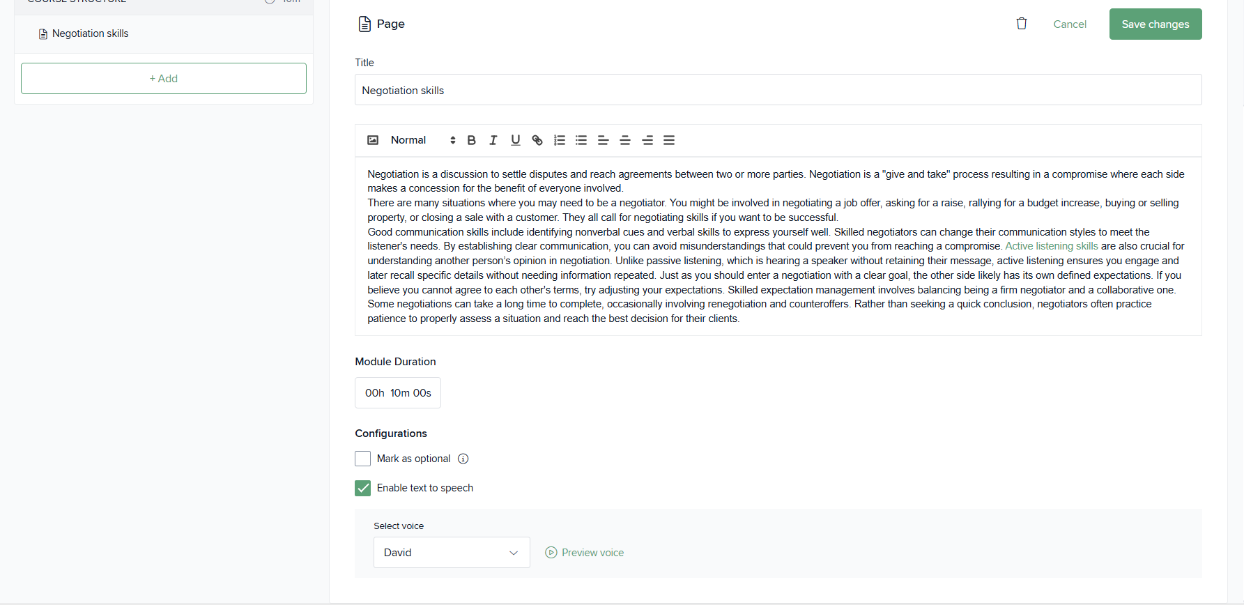 If the admin has enabled Text-to-Speech for a Page module, learners will see an audio play option within the course page. They can simply click the audio button to listen to the page content.