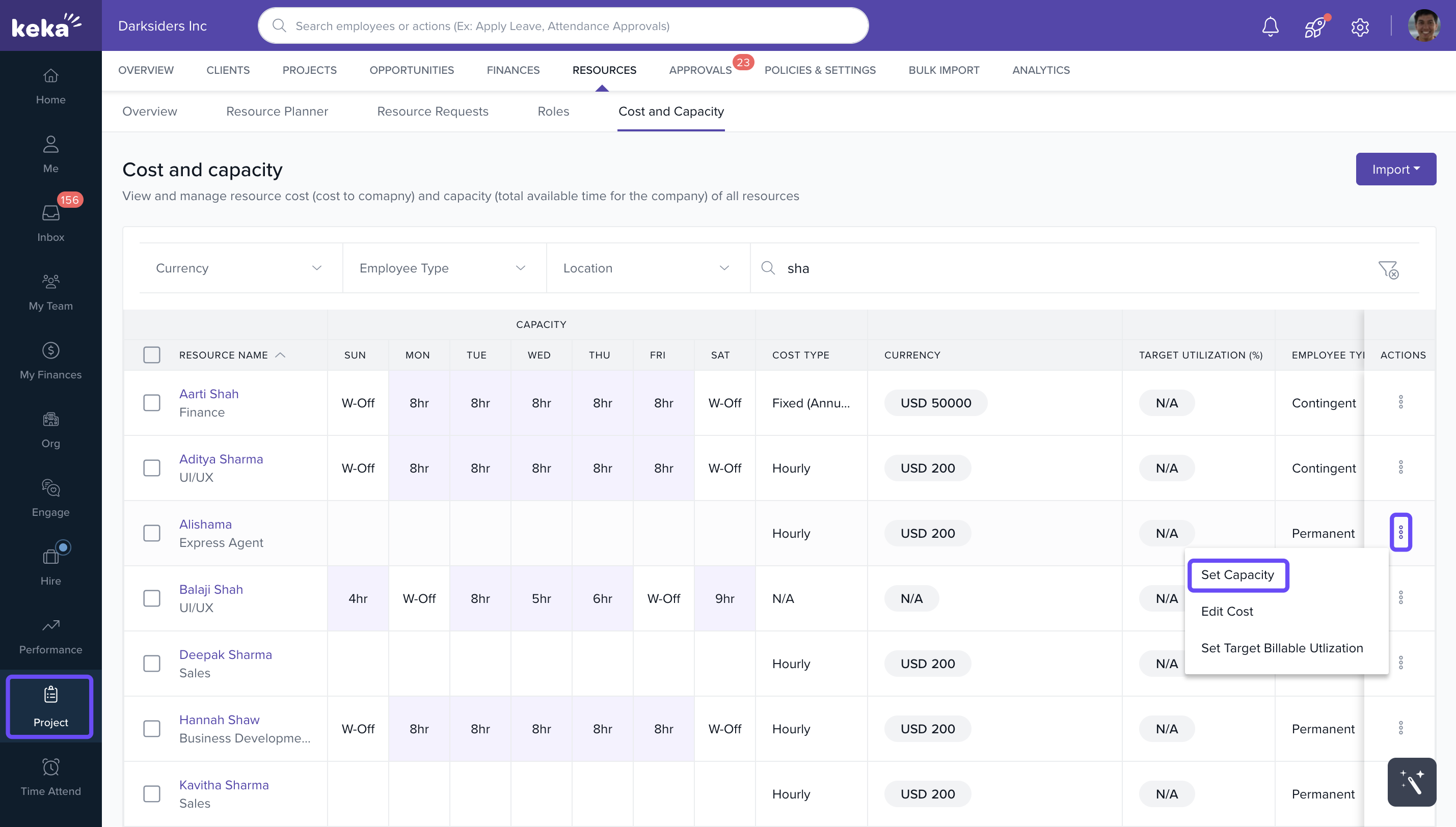 - Click on the three dots icon and select Set Capacity from the dropdown menu.
