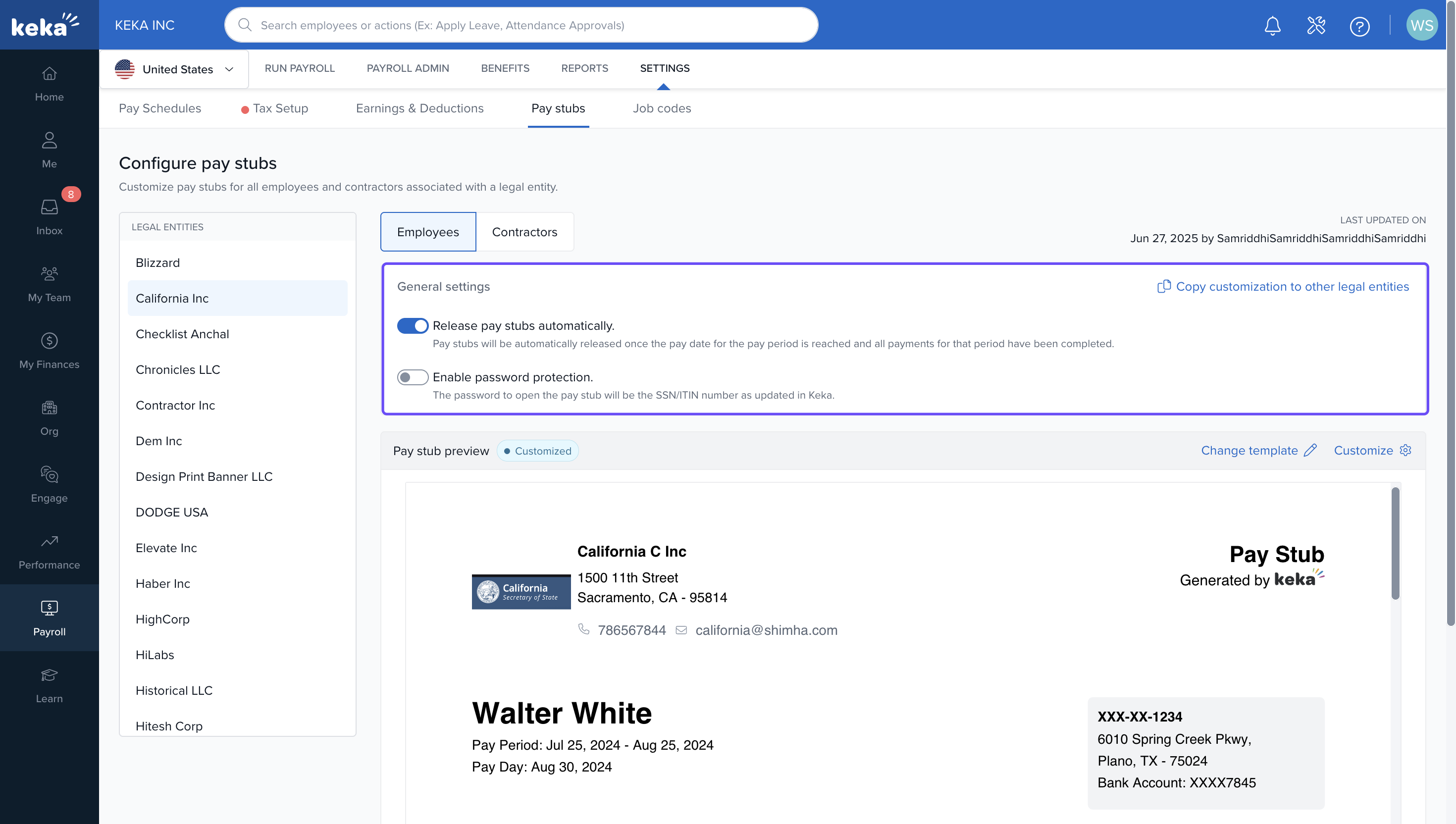 Each entity can maintain its own pay stub layout for flexibility across locations or business units.