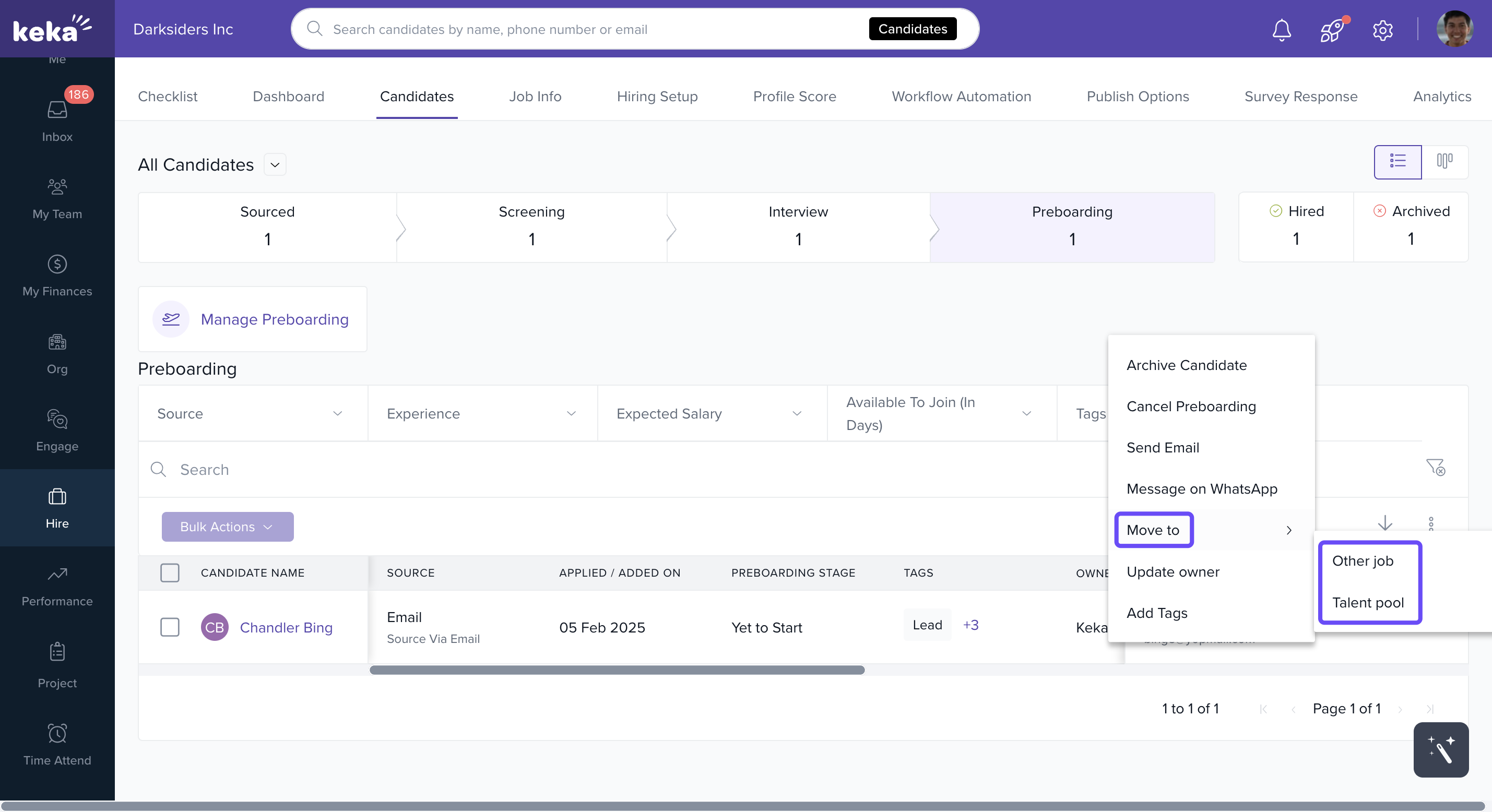 Effective candidate management is key to a smooth hiring process. In Keka Hire, HR Managers can move candidates between stages to facilitate further evaluations or update their status. This helps maintain a clean and current pipeline.