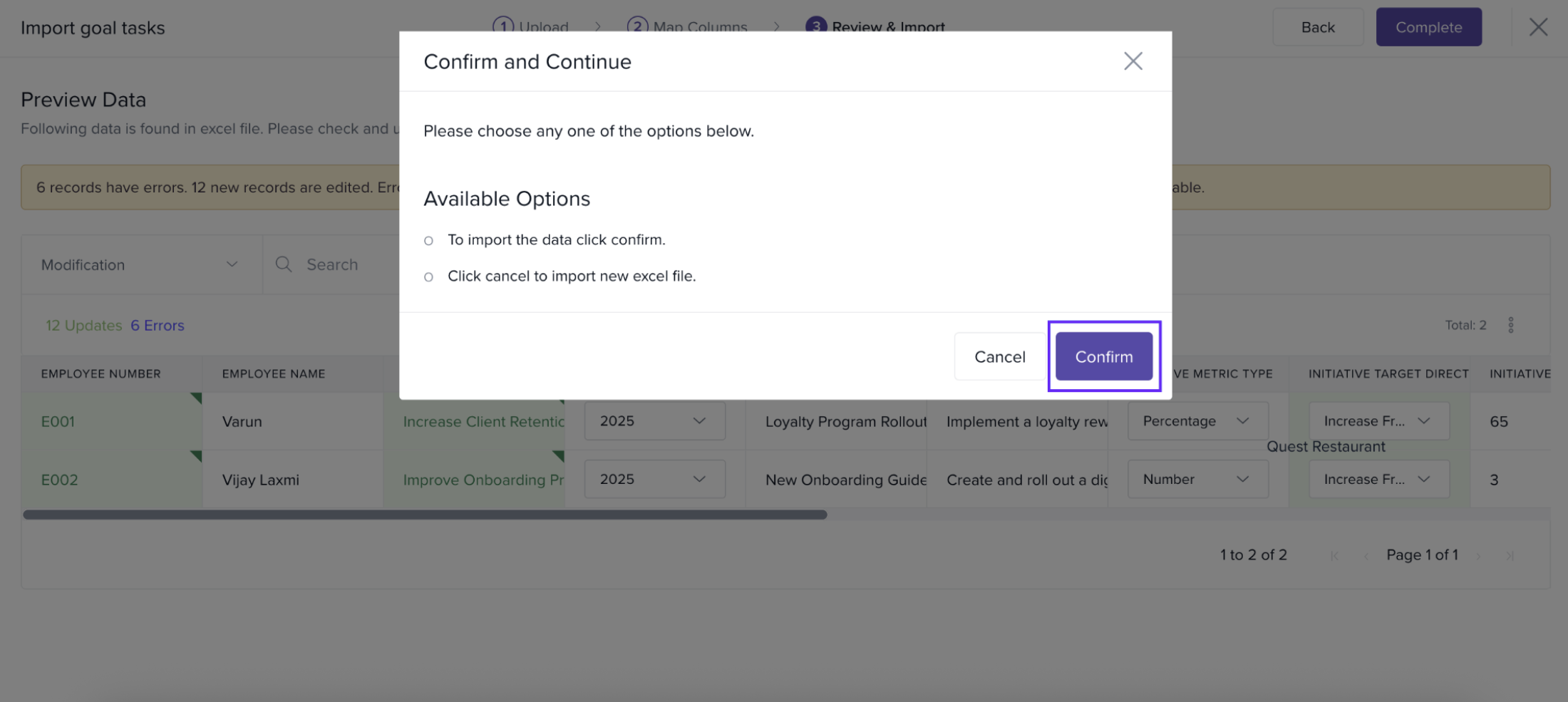 In the confirmation pop-up, click Confirm to finalise the import of tasks for goals or sub-goals.